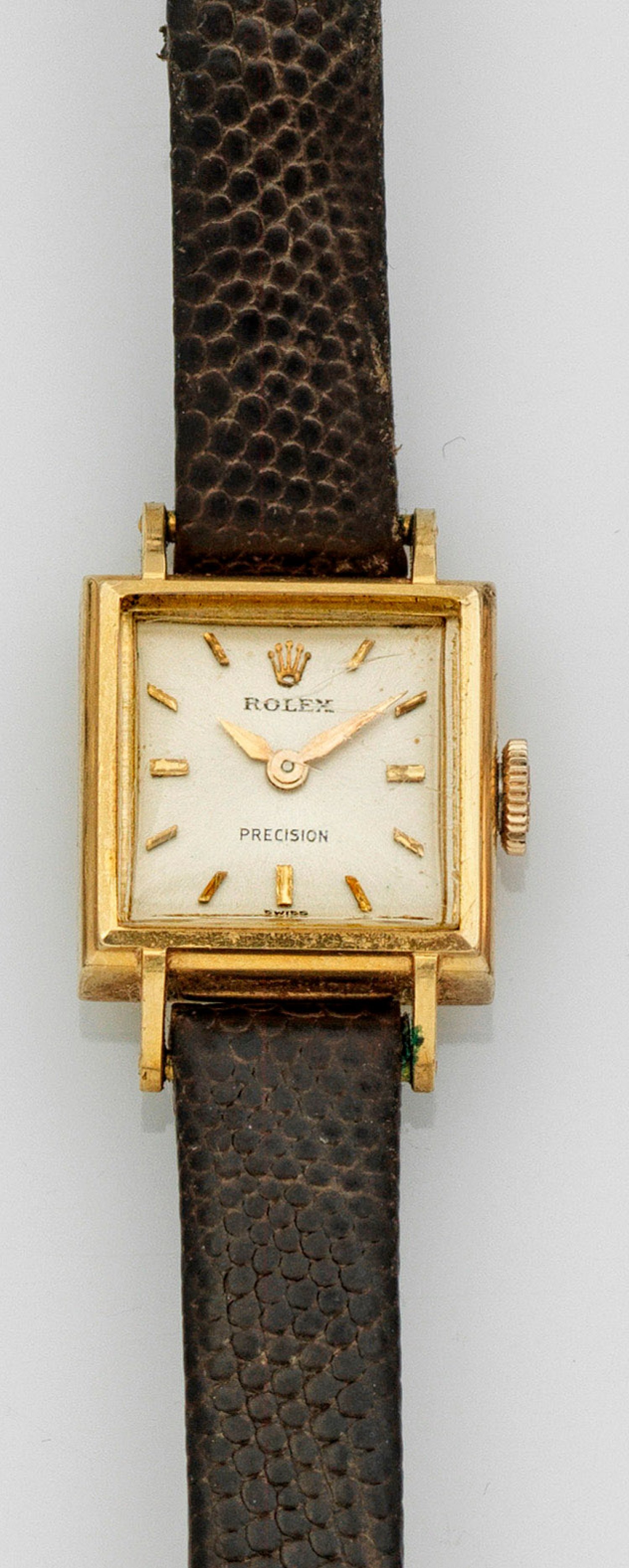 Damenarmbanduhr von Rolex-"Precision" aus den 60er Jahren Gelbgold, gest. 750. Quadratisches Uhrengehäuse, satiniertes Zifferblatt mit Stabindexen und Lanzenzeigern. Braunes Eidechsenarmband mit Dornenschließe. Mechanisches Werk mit Handaufzug. Gew. ca. 10,56 g.