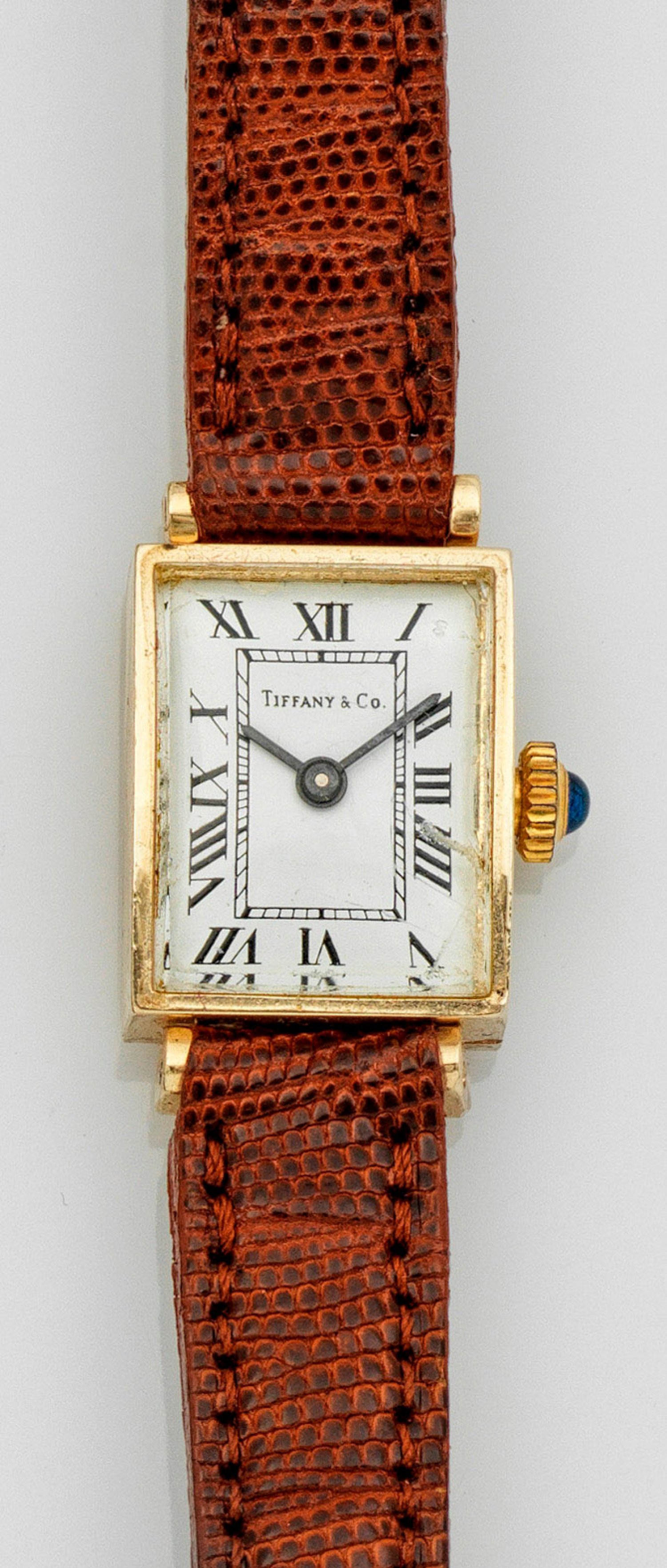 Damenarmbanduhr von Tiffany & Co. Gelbgold, gest. 14 ct.; Tankförmiges Uhrengehäuse, weißes Zifferblatt mit schwarzen arabischen Zahlen und Lanzenzeigern. Hellbraunes Eidechsenarmband. Mechanisches Werk mit Kronenaufzug, Saphircabochon. Gew. ca. 9,95 g.