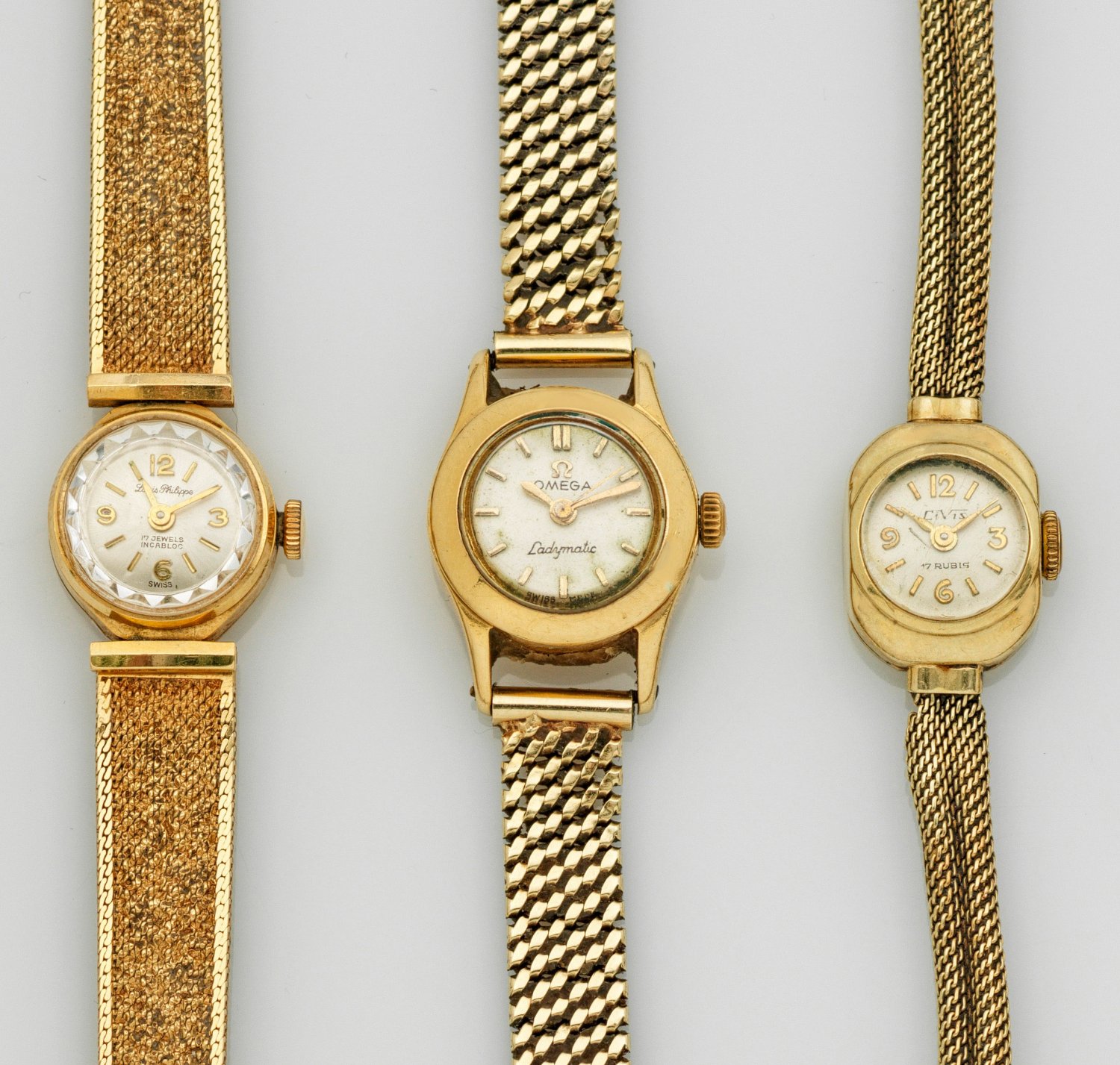 Drei Damenarmbanduhren aus den 50er Jahren u. a. von Omega. Gelbgold, gest. 585, 585 und 750. Runde Uhrengehäuse mit Gold-Indexen und Lanzenzeigern. Feine Gliederarmbänder mit Faltschließe. Mechanisches Werk mit Handaufzug. Ges.-Gew. ca. 63,10 g.