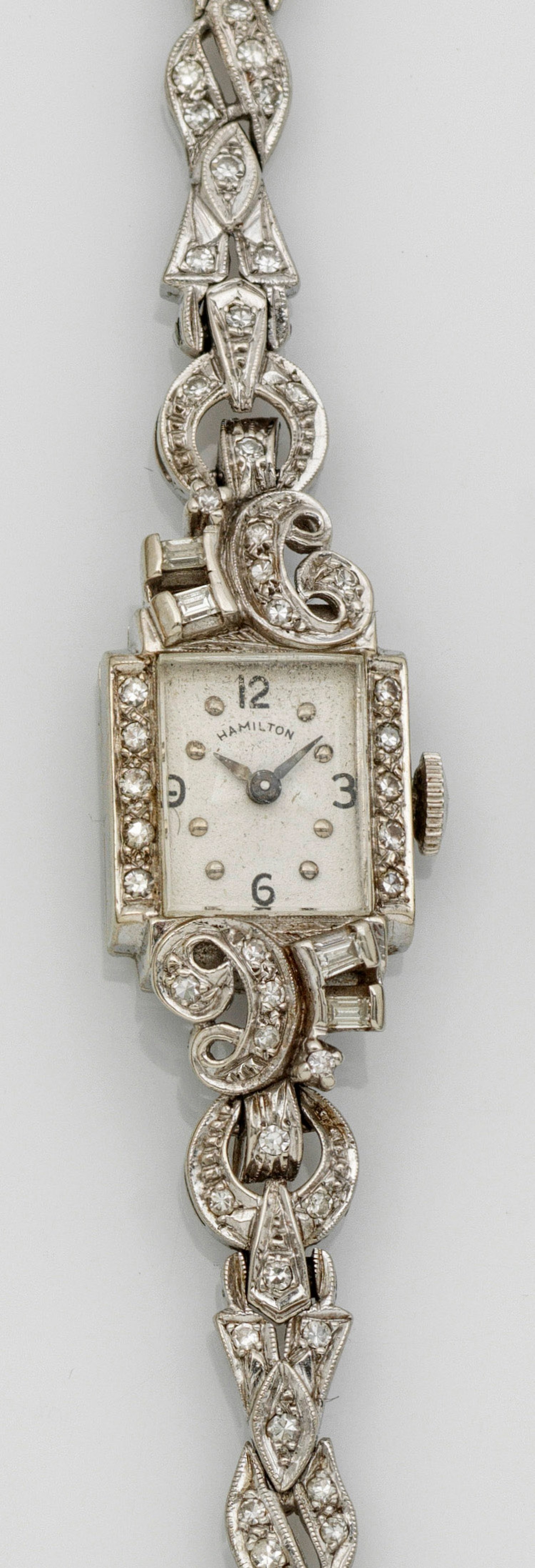 A lady's wristwatch by Hamilton, set with diamonds. Mechanical movement, in 14 k white gold.