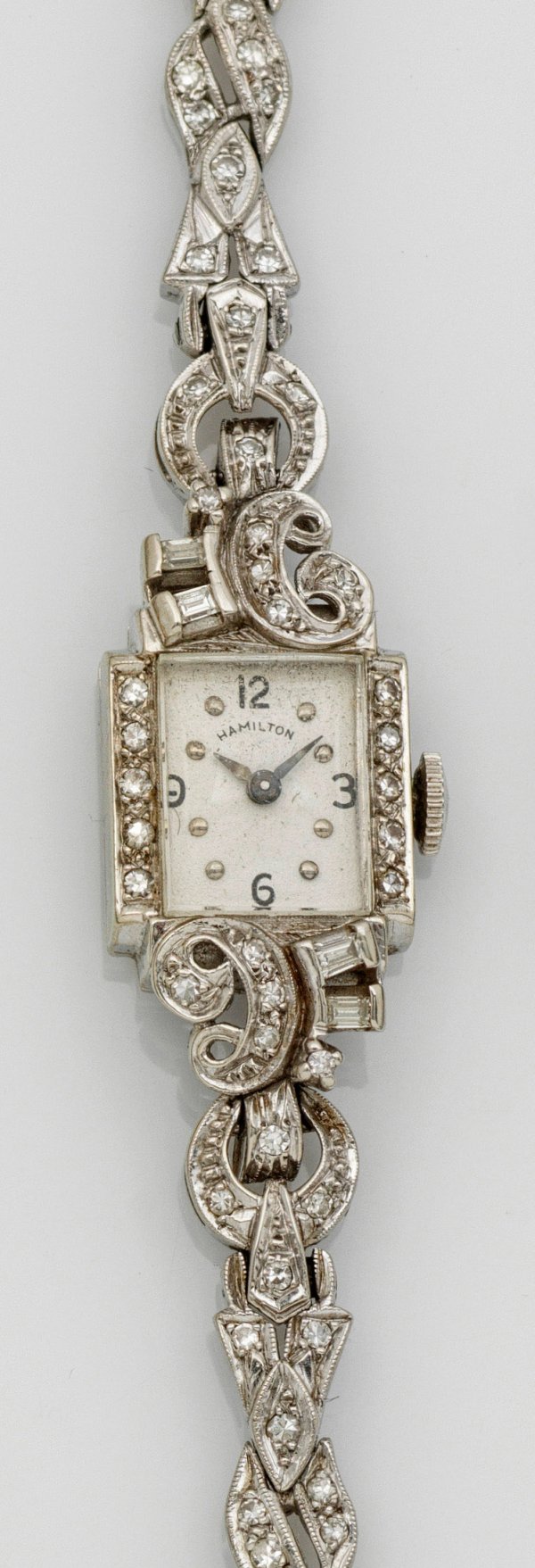 Cocktail-Armbanduhr von Hamilton aus den 40er Jahren Weißgold, gest. 14 ct.; Tankförmiges Uhrengehäuse, satiniertes Zifferblatt mit arabischen Zahlen und Indexen, Lanzenzeiger. Armband aus stilisierten Blattvoluten in Ajour. Ausgefasst mit Diamanten. Mechanisches Werk mit Handaufzug. Gew. ca.19,89 g.