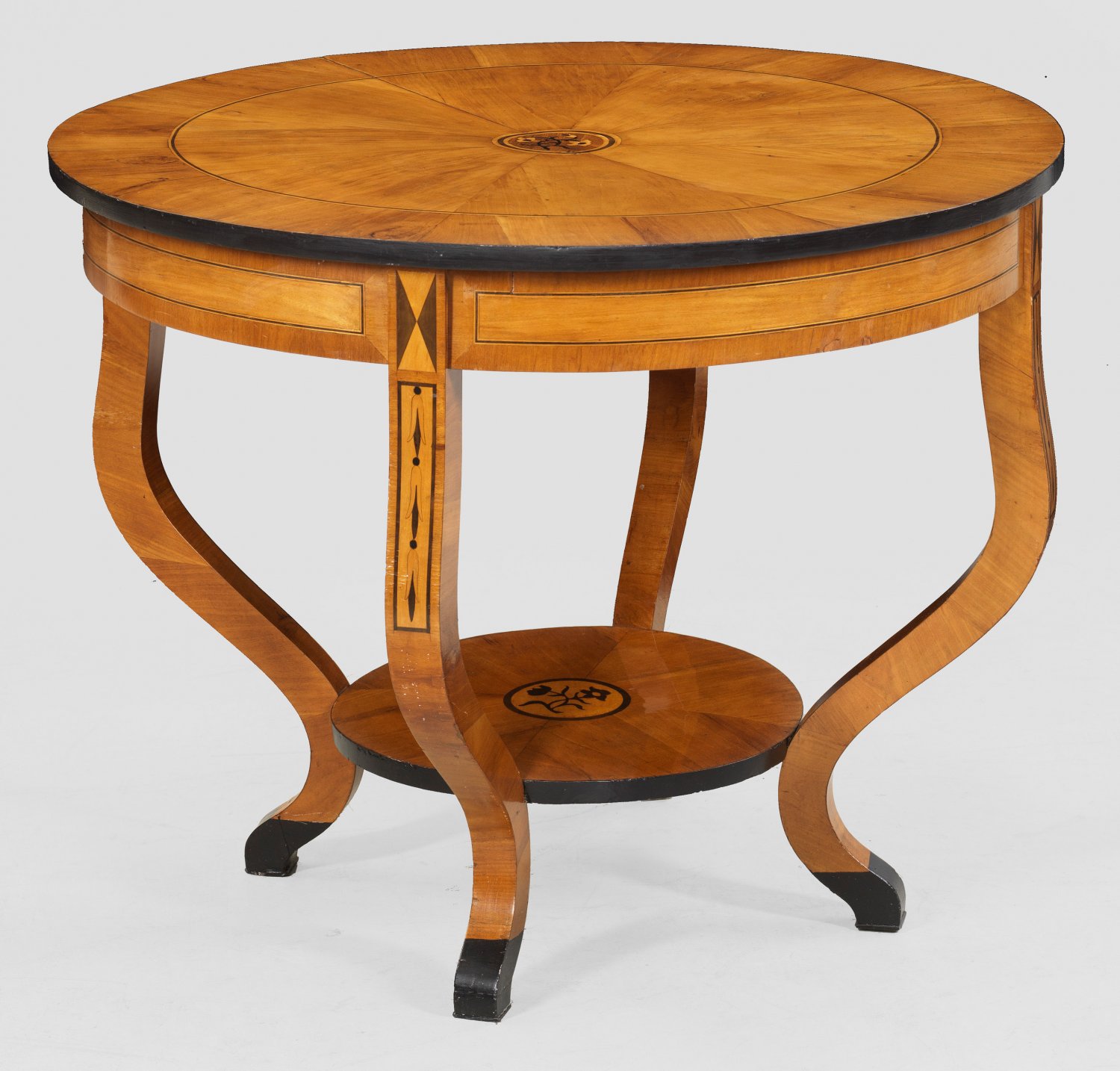 Biedermeier-Salontisch Kirschbaum und Nussbaum, furniert sowie teilw. ebonisiert. Bombierte Zarge auf stark geschwungenen Beinen, dazwischen durch Ablagefach verbunden. Gering überstehende, runde Deckplatte mit zentriert angeordneten Furnierfeldern. Intarsierte Reserven mit Blüten. H. 80 cm. D. 101 cm.