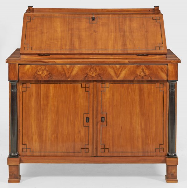 Biedermeier-Sekretär Kirschbaum, massiv und furniert sowie teilw. ebonisiert. Gerader, rechteckiger Korpus, flankiert von eingestellten Halbsäulen. In der gegliederten Front zwei große Türen. Gering überstehende Deckplatte als Auflage für schräggestellte, abklappbare Arbeitsfläche. Flache Galerierahmung als oberer Abschluss. H. 115 cm. 117 cm x 58 cm.