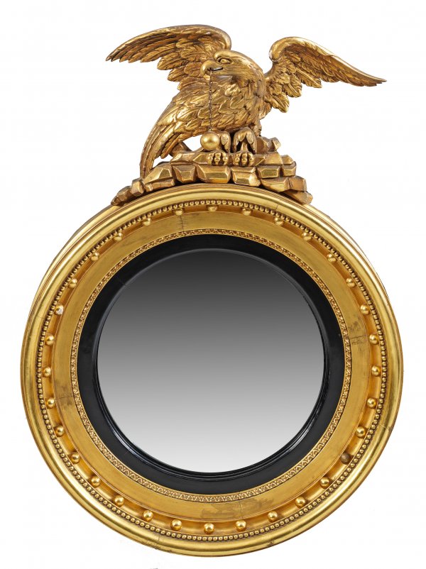 Konvexspiegel im Empire-Stil Holz, geschnitzt, gefasst und vergoldet sowie teilw. schwarz lackiert. Breite, runde, umlaufend profilierte Spiegelrahmung aus Perlstab mit vollplastisch gestalteter Bekrönung in Gestalt eines Adlers. Gewölbtes Spiegelglas. 75 cm x 54 cm.