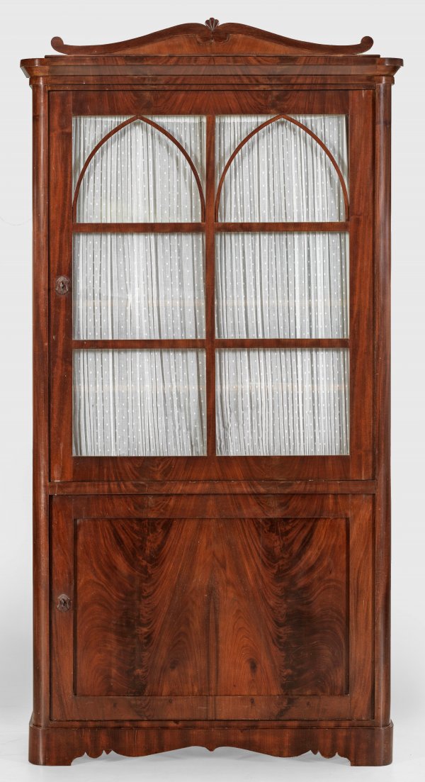 Biedermeier-Bücherschrank Mahagoni, furniert. Gerader, hochrechteckiger Korpus auf schmaler Zarge und gerundeten Füßen. In der gegliederten Front zwei teilw. sprossenverglaste Vitrinentüren mit stilisierten Spitzbögen. Innen Ablageflächen und Schubfach. Profilgesims und geschweift ansteigender oberer Abschluss. H. 202 cm. 105 cm x 40 cm.
