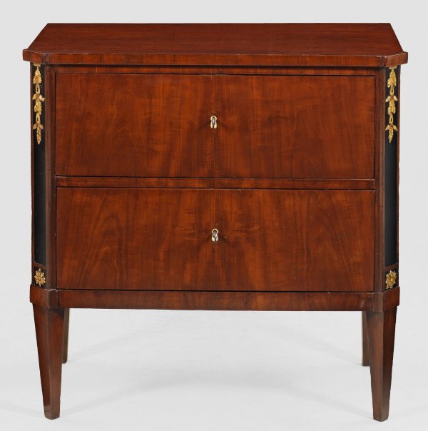 Kleine Biedermeier-Kommode Mahagoni, furniert sowie teilw. ebonisiert. Gerader, rechteckiger Korpus, flankiert von schräggestellten Ecklisenen auf konischen Vierkantbeinen. In der gegliederten Front zwei Schubladen. Gering überstehende Deckplatte. Rest. mit Erg.; H. 80 cm. 80 cm x 43 cm.