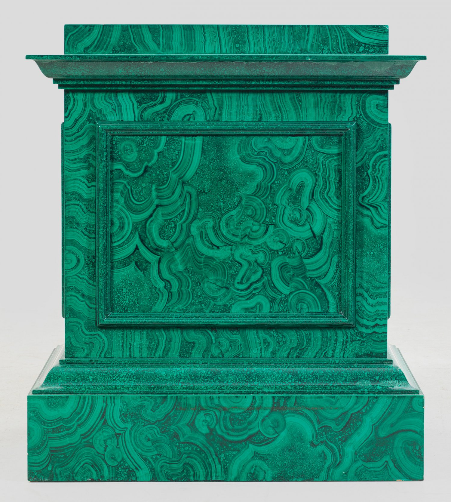 Großer extravaganter Podestsockel Holzkorpus mit flächendeckendem Lackfond in Malachitoptik. Über rechteckiger, profilierter Basis, kubenartiger Podestsockel, allseitig mit schmalen Profilkassetten. Weit überstehende, gestuft ansteigende Deckplatte. H. 90,5 cm. 79 cm x 50 cm.