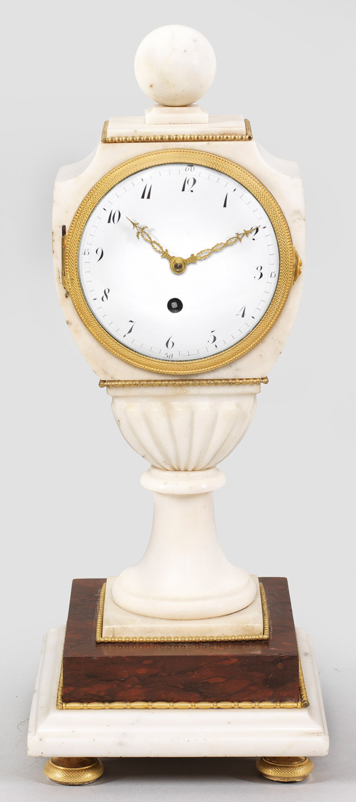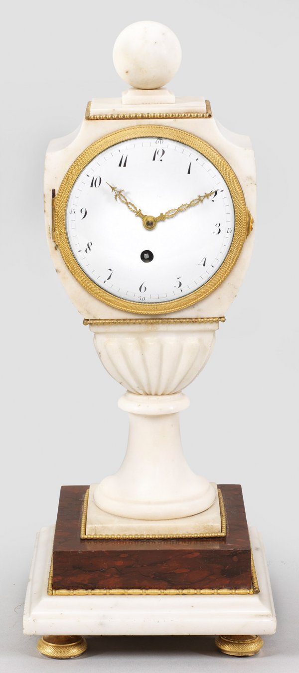 Empire-Vasenpendule Weißer sowie bordeauxrot gemaserter Marmor und vergoldete Bronze. Balusterförmiger, teilw. godronierter Korpus mit Kugelbekrönung auf hoher, geschweift ansteigender Basis sowie gestuft ansteigendem Sockel. Verglastes Emailzifferblatt sowie Messingwerk mit Fadenaufhängung. H. 39,5 cm.