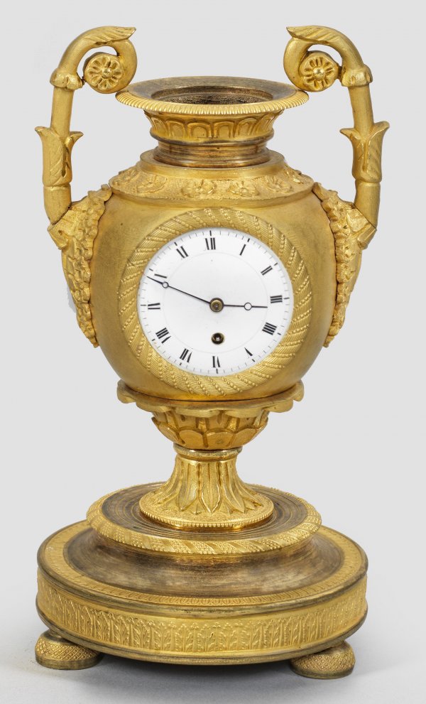 Kleine Empire-Vasenuhr Bronze, vergoldet. Balusterförmiger Korpus mit blütenreliefierten Henkeln aus eingerollten Voluten auf geschweift ansteigendem Rundsockel mit Palmettenfries. Profilgerahmtes Emailzifferblatt. Werk mit Kette und Schnecke. Platine bez. Le Noir à Paris. H. 17 cm.