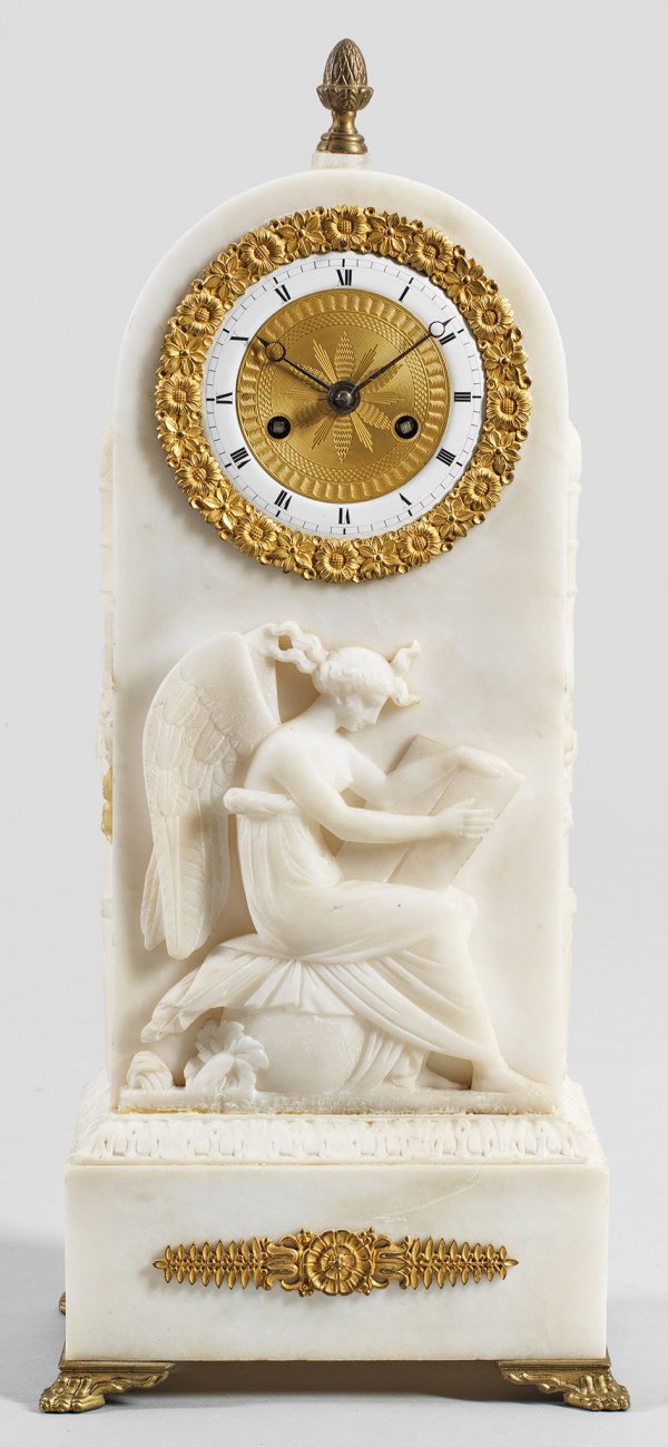 Empire-Pendule Alabaster und vergoldete Bronze. Schmaler, hochrechteckiger Korpus mit segmentförmigem oberen Abschluss und erg. Zapfenbekrönung. In der Front erhaben reliefierte allegorische Darstellung einer Genie. Rechteckiger Sockel mit Palmettenfries und erg. Tatzenfüßen. Blütengerahmtes, guillochiertes Zifferblatt mit Emailziffernring. Pendulenwerk mit Fadenaufhängung sowie Halbstundenschlag auf Glocke. H. 44,5 cm. 19 cm x 13 cm.