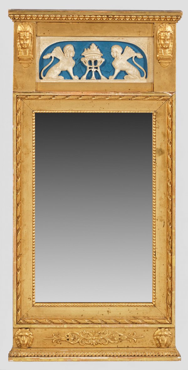 Kleiner Pfeilerspiegel im Empire-Stil Holz, stuckiert, gefasst und vergoldet. Hochrechteckige, profilierte Spiegelrahmung. Breites Giebelfeld mit erhaben reliefierten Sphinxen, flankiert von Pharaonenköpfen. Facettiertes Spiegelglas. 77 cm x 38,5 cm.