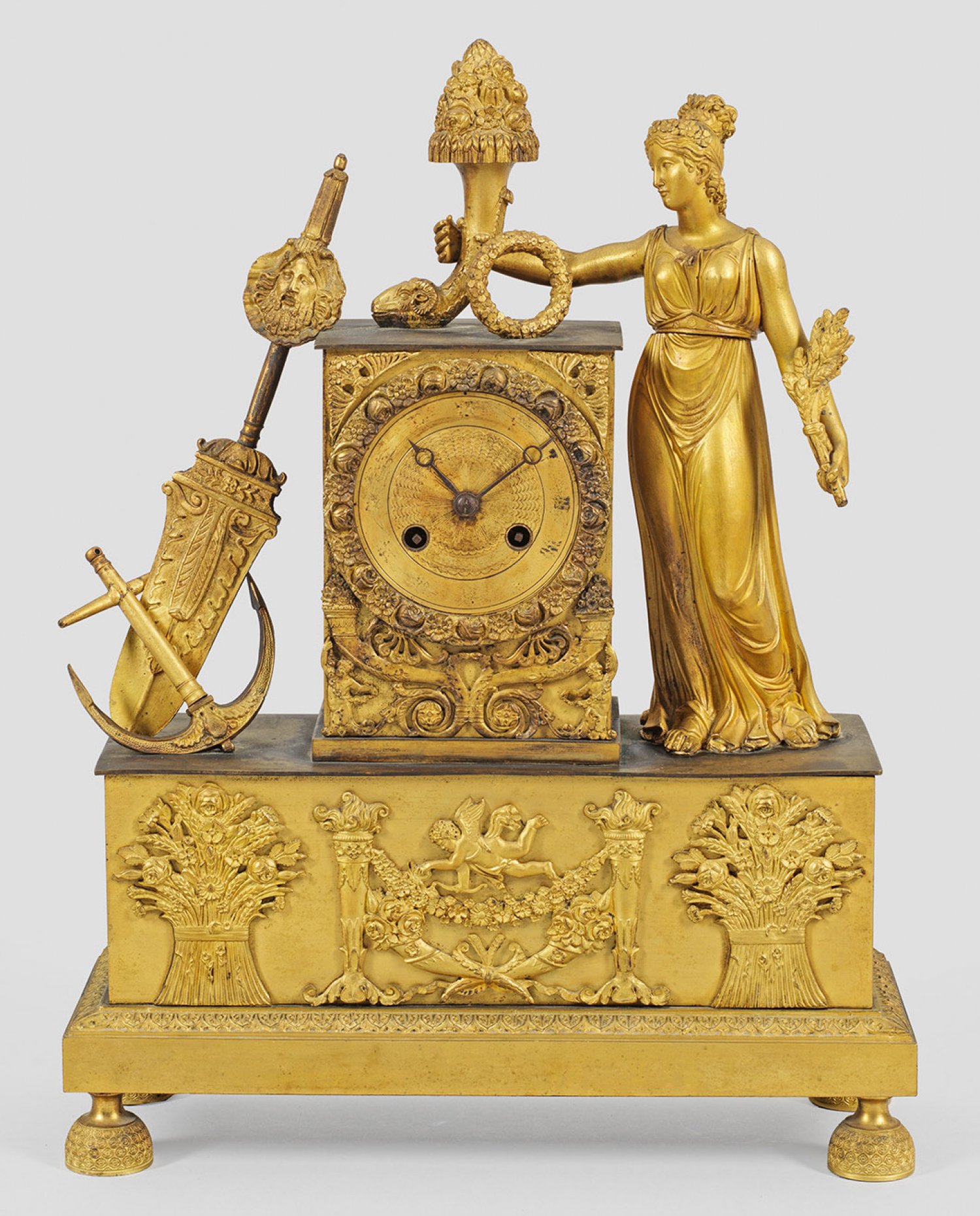 Empire-Pendule Bronze, vergoldet. Vollplastische allegorische Darstellung von Ceres mit Ährengarbe und Füllhorn. Rechteckiges Uhrengehäuse mit profilgerahmtem Zifferblatt. Unterhalb breiter Sockel mit reliefierten Ährenbündeln. Pendulenwerk mit Fadenaufhängung sowie Halbstundenschlag auf Glocke. Altersspuren. H. 38 cm. 29 cm x 10,5 cm.