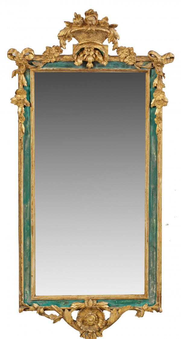 Kleiner Louis XVI-Wandspiegel Holz, geschnitzt, seegrün gefasst und teilw. vergoldet. Hochrechteckige, profilierte Spiegelrahmung. Bekrönung in Form eines erhaben reliefierten Korbes, umgeben von schleifenbekrönten Blütenfestons. Unterer Abschluss aus zentraler Blütenrosette mit Blattwerk. 87 cm x 43 cm.
