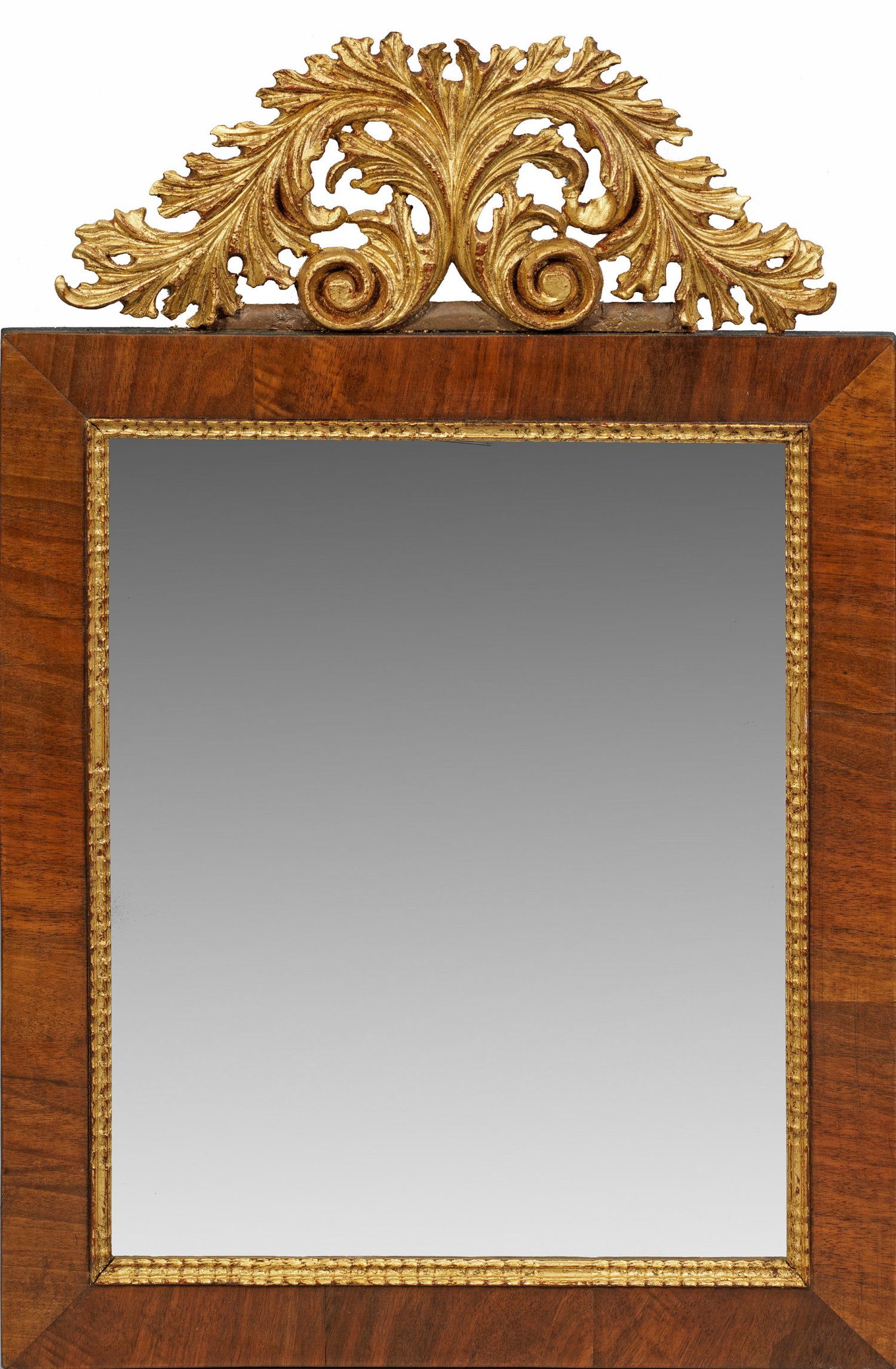 Rahmen im Barock-Stil Nussbaum, furniert sowie Holz, geschnitzt, gefasst und vergoldet. Gerade, rechteckige Rahmung mit Flammleistenprofil sowie durchbrochen gearbeitete Bekrönung aus gegeneinandergestellten Blattvoluten. 74 cm x 48,5 cm. Falzmaß 46 cm x 37,5 cm.
