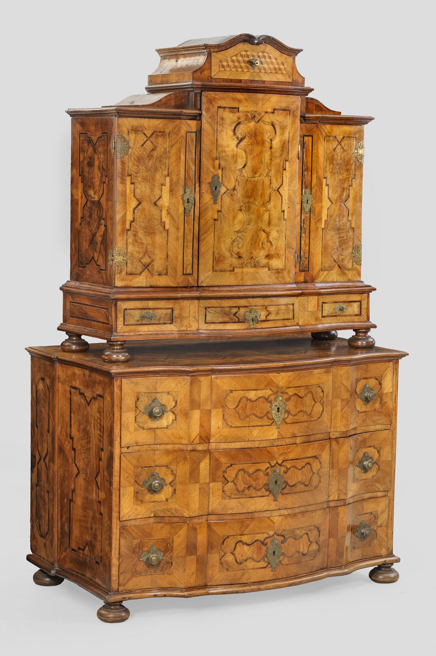 Außergewöhnliche große Barock-Aufsatzkommode Nussbaum, furniert sowie Einlagen aus unterschiedlichen, teilw. grün gefärbten Edelhölzern. Gerader, an den hinteren Ecken verkröpfter Korpus auf schmaler Profilzarge und gedrückten Füßen. Drei breite, mehrfach geschweifte Schubladen. Gering überstehende, profilierte Deckplatte. Weit zurückgesetzter Kabinettaufsatz auf korrespondierenden Füßen. In der gegliederten Front breites Schubfach sowie zwei, teilw. faltbare, leicht bombierte Türen unterschiedlicher Größe. Dahinter aufwändige, reich gestaltete Kabinetteinteilung aus diversen Schubfächern mit aufwändigen süddeutschen/alpenländischen Intarsienpaneelen des 16. Jh. aus eingerollten Voluten und Architekturmotiven. Teilw. Auskleidung mit Marmorpapier. Innentüren mit entsprechendem Intarsiendekor. Gestaffelt angeordneter und geschweift ansteigender oberer Abschluss mit zentraler Schublade. Flächendeckend breit gerahmte Furnierfelder, von teilw. verschlungenen Bandeinlagen begrenzt. H. 196 cm. 128 cm x 72 cm.
