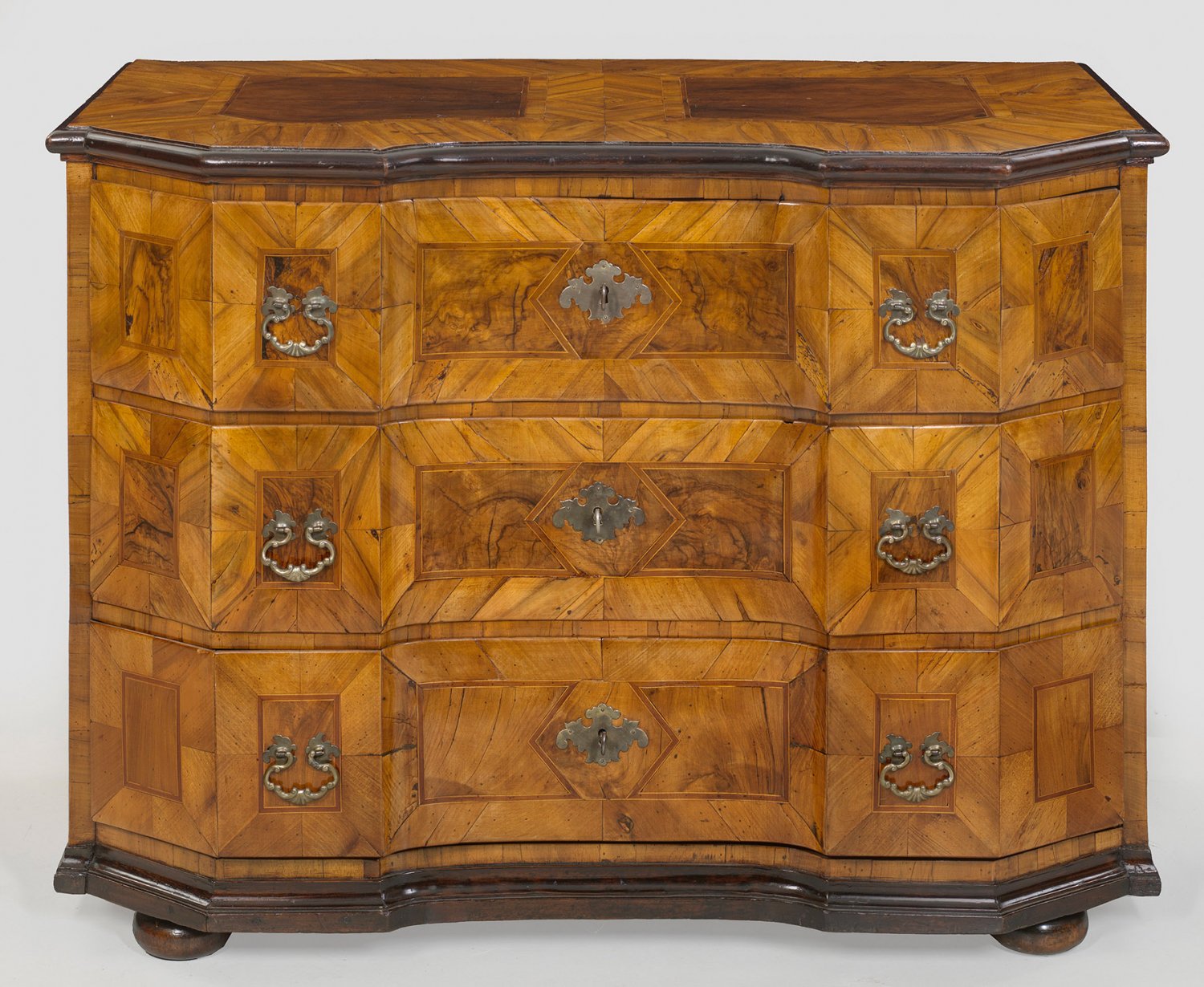 Große Barock-Kommode Nussbaum, furniert und teilw. ebonisiert sowie Einlagen aus Pflaumenholz. Gerader, rechteckiger Korpus auf schmaler Profilzarge und gedrückten Kugelfüßen. In der gegliederten Front drei breite, abgekantete und mittig konkav eingezogene Schubladen. Gering überstehende Deckplatte. Flächendeckend breit gerahmte Furnierfelder, von Bandeinlagen begrenzt. H. 94 cm. 128 cm x 69 cm.