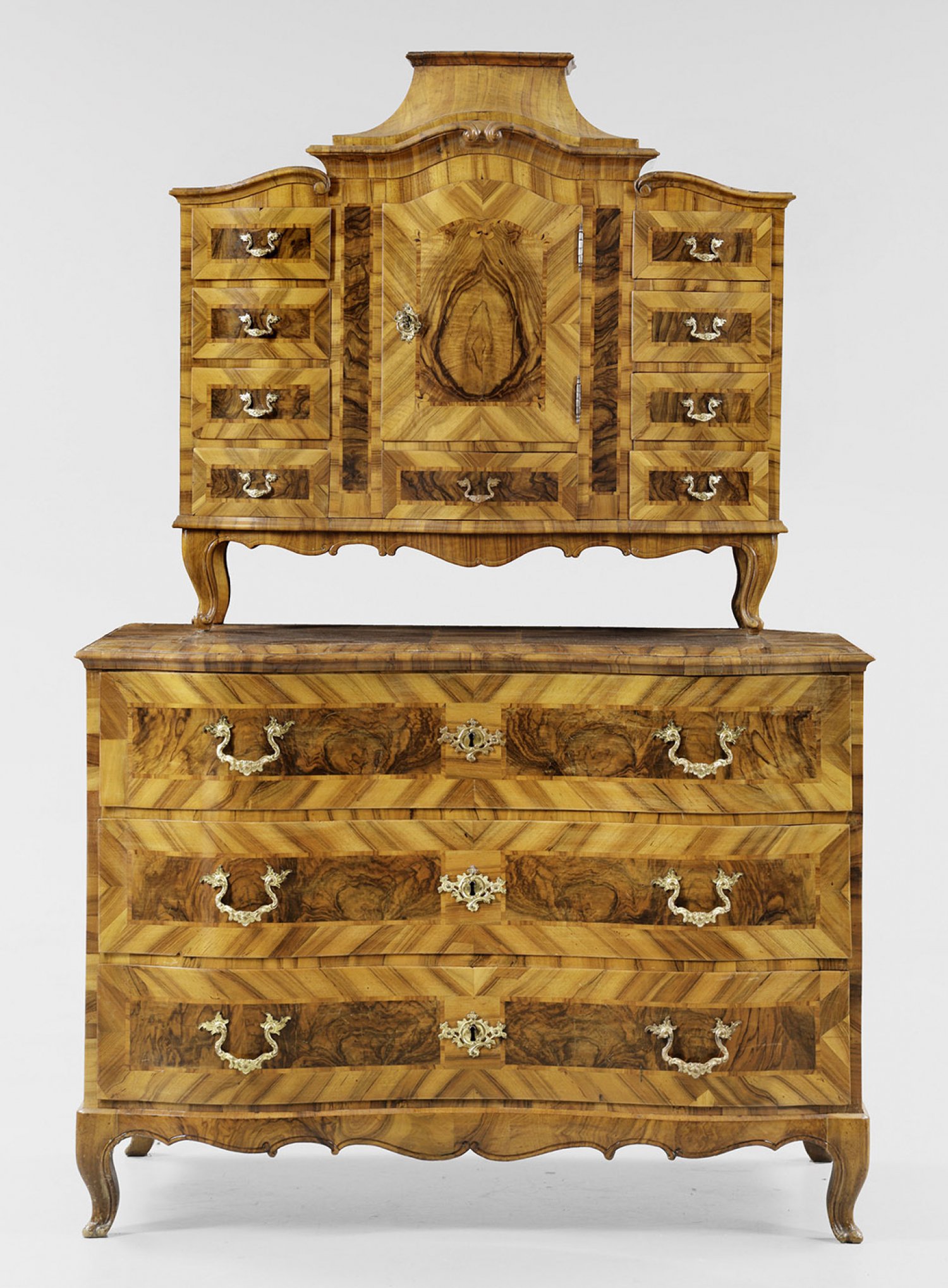 Barock-Aufsatzkommode Nussbaum, furniert. Gerader Korpus auf passig geschweiftem Zargensockel und Volutenfüßen. In der gegliederten Front drei breite, doppelt geschweifte Schubladen. Gering überstehende, profilierte Deckplatte. Korrespondierender, weit zurückgesetzter Aufsatz auf entsprechenden Volutenbeinen mit zentraler Tabernakeltür, umgeben von neun Schubladen unterschiedlicher Größe. Schmales, gestaffelt angeordnetes, geschweift ansteigendes Gesims sowie podestförmiger oberer Abschluss. Flächendeckend breit gerahmte Furnierfelder, von Bandeinlagen begrenzt. H. 185 cm. 122 cm x 66 cm.