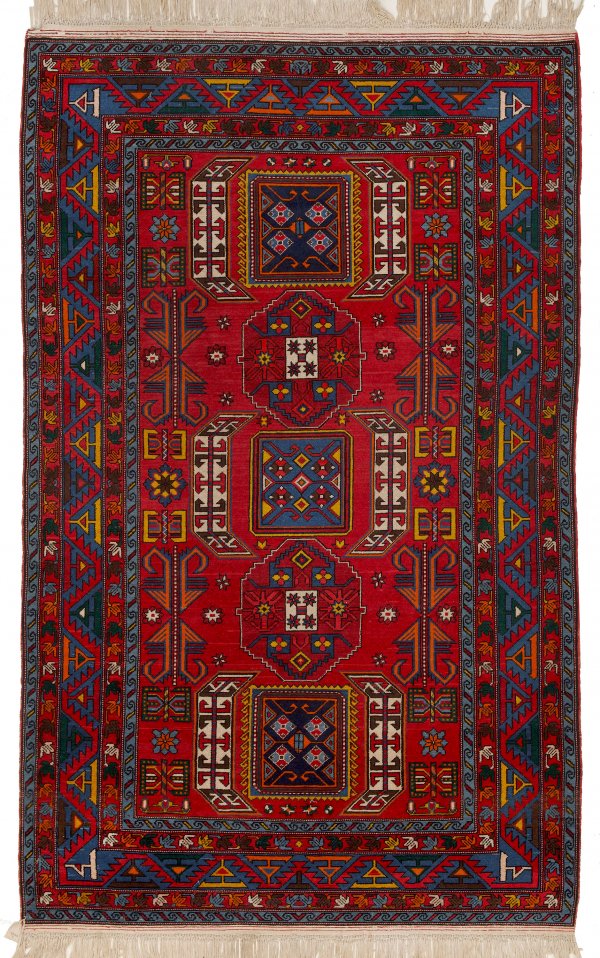 Eriwan-Brücke Kaukasus. Mitte 20. Jh.; Im roten Innenfeld unterschiedliche Rautenmotive und Blattspangen sowie umlaufend breite, mehrteilige Bordüre aus unterschiedlichen Ornamentbändern. 220 cm x 145 cm.