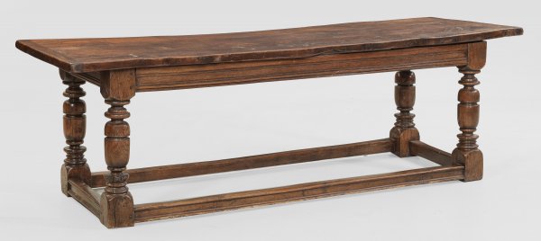 Refektoriumstisch Eichenholz. Gerade, profilierte Zarge auf mehrfach gegliederten Balusterbeinen, unterhalb durch gerade Stege verbunden. Rechteckige, kräftige Deckplatte aus Bohlen. H.75 cm. 78,5 cm x 239 cm.