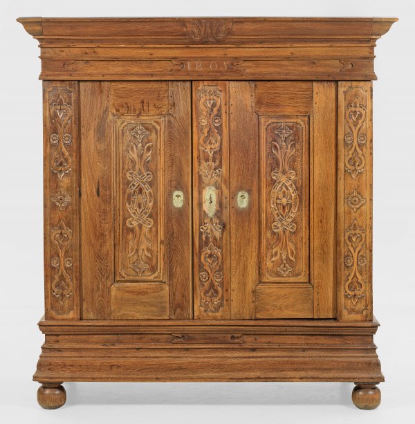Großer Dielenschrank Eichenholz. Gerader, rechteckiger Korpus auf profiliertem Sockel und kräftigen Kugelfüßen. In der gegliederten Front zwei große kassettierte Türen, flankiert von breiten Ecklisenen mit stilisiertem, erhaben reliefiertem Rankenwerk und Blüten. Weit vorkragendes Kranzgesims, bez. 1805. H. 200 cm. 192 cm x 75 cm.