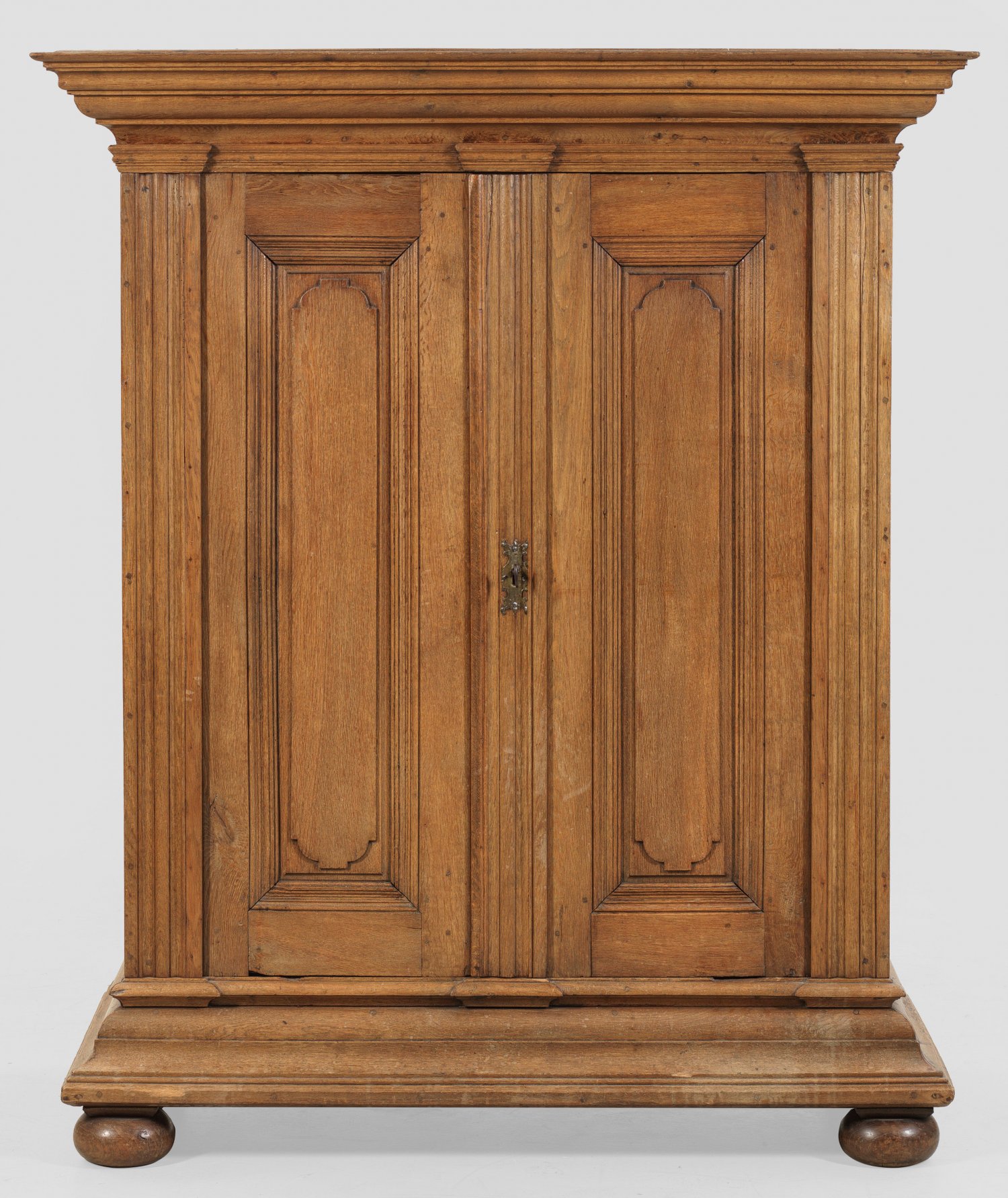 Kleiner Barock-Dielenschrank Eichenholz. Gerader, rechteckiger Korpus auf stark profiliertem Sockel und gedrückten Kugelfüßen. In der gegliederten Front zwei Kassettentüren mit kartuschenförmigen Füllungen, flankiert von breiten Lisenen. Weit vorkragendes, profiliertes Kranzgesims. H. 170 cm. 151 cm x 66 cm.