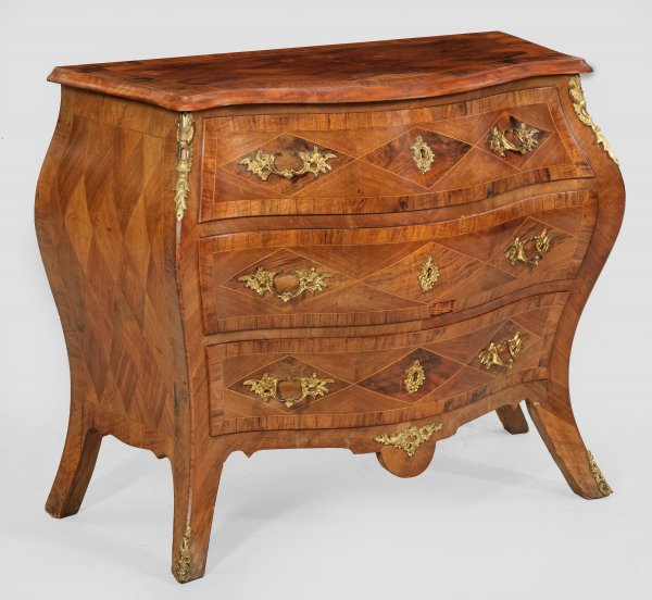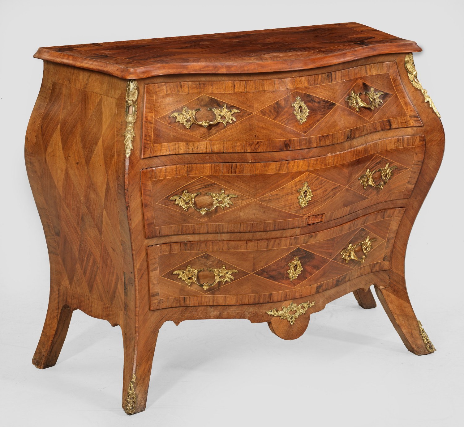 Rokoko-Kommode Nussbaum, furniert. Dreiseitig stark bombierter Korpus, flankiert von schmalen Ecklisenen, in ausgestellte Füße übergehend. In der gegliederten Front drei breite Schubladen. Gering überstehende, profilierte Deckplatte. Flächendeckend breit gerahmte Furnierfelder aus Rautenmarketerie. H. 79,5 cm. 92,5 cm x 50 cm.