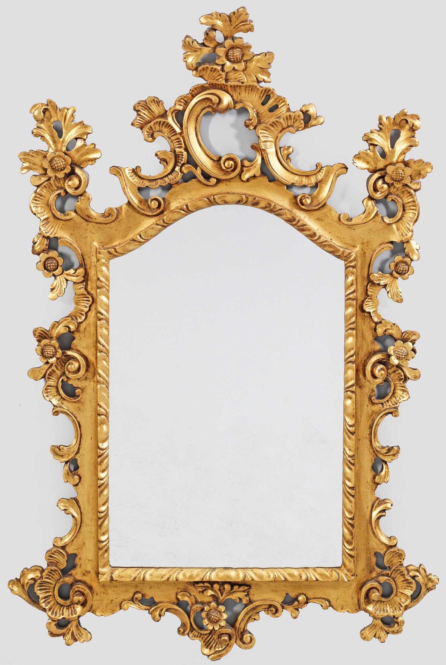 Großer Wandspiegel im Rokoko-Stil Holz, geschnitzt, gefasst und vergoldet. Hochrechteckige, profilierte Spiegelrahmung mit gewölbtem oberen Abschluss, umgeben von üppigen eingerollten Blattvoluten und Blüten. Durchbrochen gearbeitete, asymmetrisch gestaltete Bekrönung aus Rocaillen. 135 cm x 84 cm.