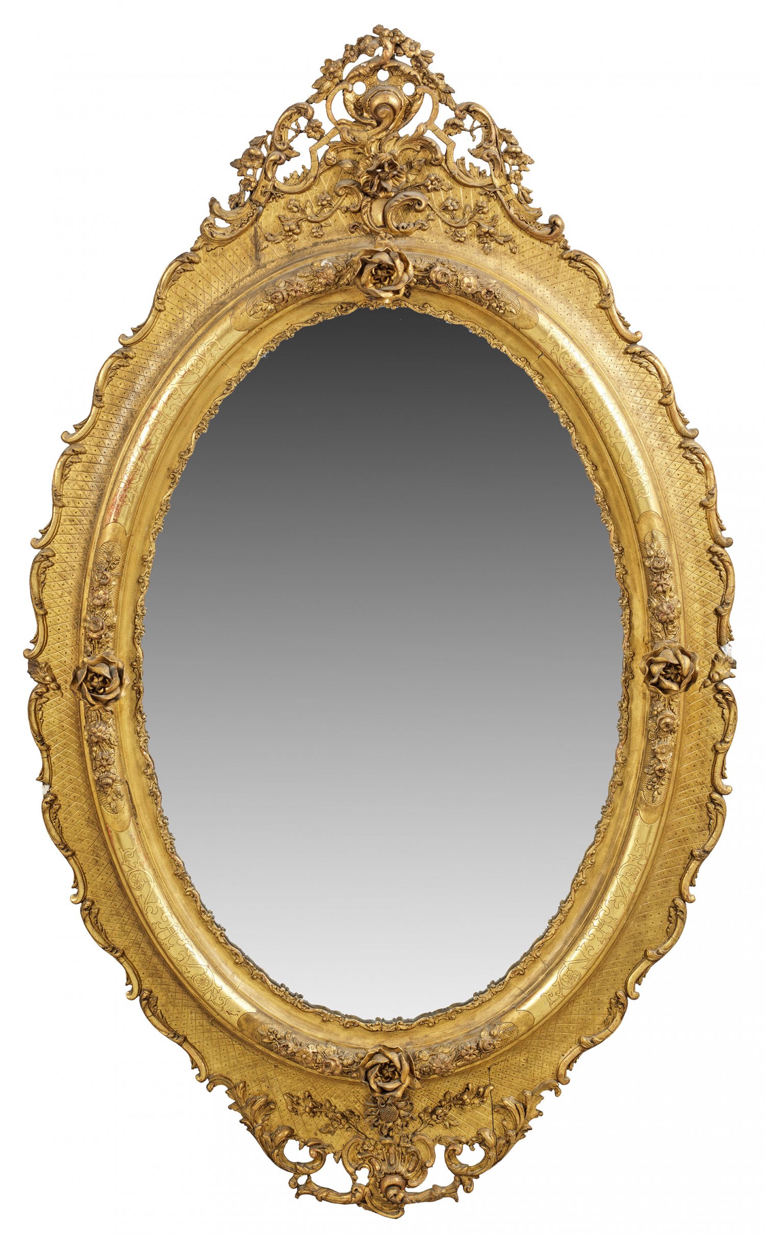 Großer Belle Epoque-Wandspiegel Holz, stuckiert, gefasst und vergoldet. Hochovale, breite, passig geschweifte Spiegelrahmung aus fein angelegtem Gitterwerk und Ranken, umgeben von Volutenspangen. Durchbrochen gestaltete Bekrönung und Dekorationen aus erhaben reliefierten Blütenmotiven und Blattranken sowie korrespondierender unterer Abschluss. 166 cm x 98 cm.