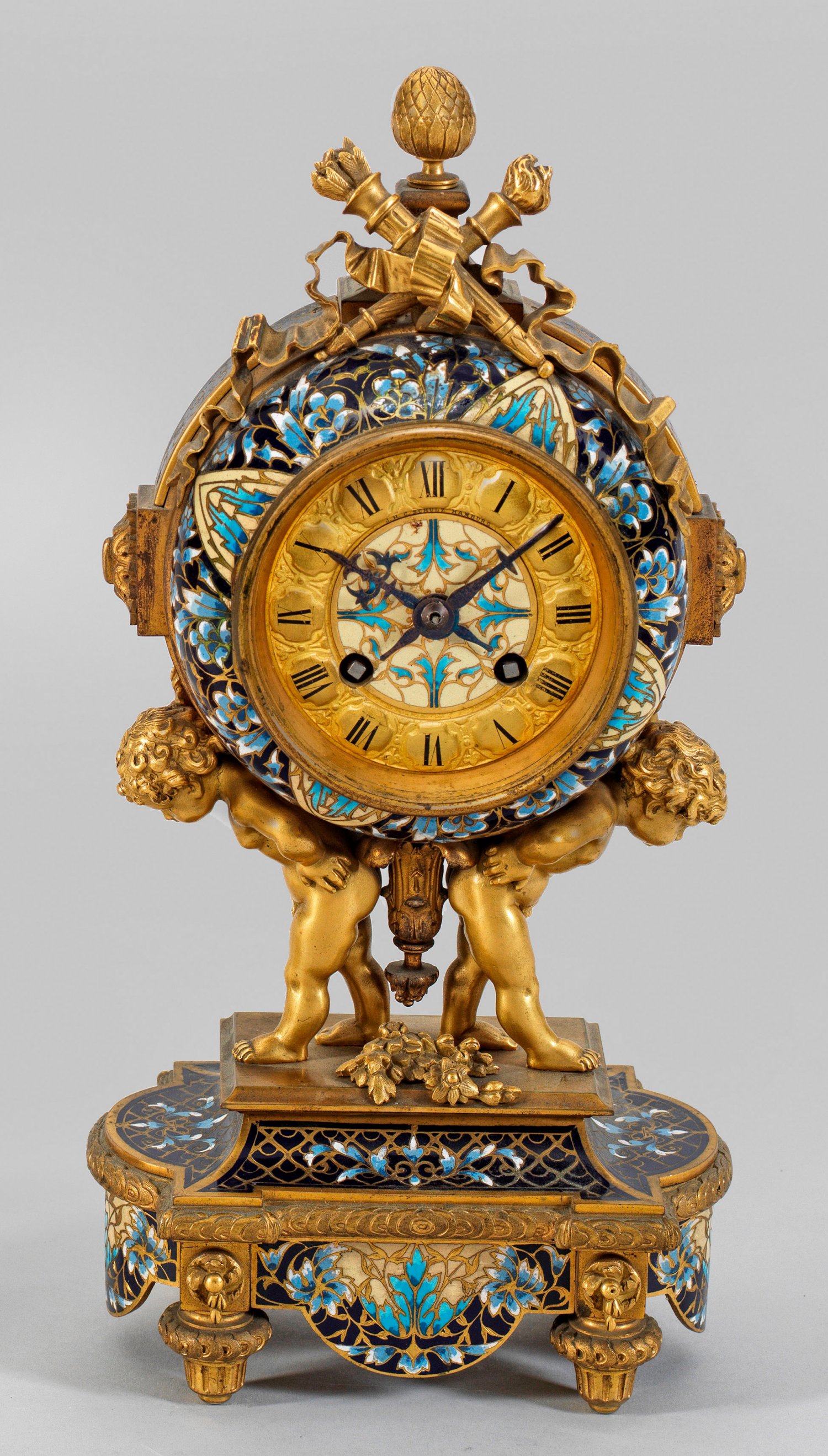 Napoleon III-Champlevé-Pendule Bronze sowie Emaille in unterschiedlichen Blau- und Cremetönen in sog. Champlevé-Technik. Über passig geschweiftem Sockel mit Balusterfüßen vollplastisch gestaltete Puttenkinder als Träger für rundes Uhrengehäuse mit Köcherbekrönung. Profilgerahmtes Zifferblatt. Mechanisches Werk mit Echappement sowie Halbstundenschlag auf Glocke. H. 33 cm.