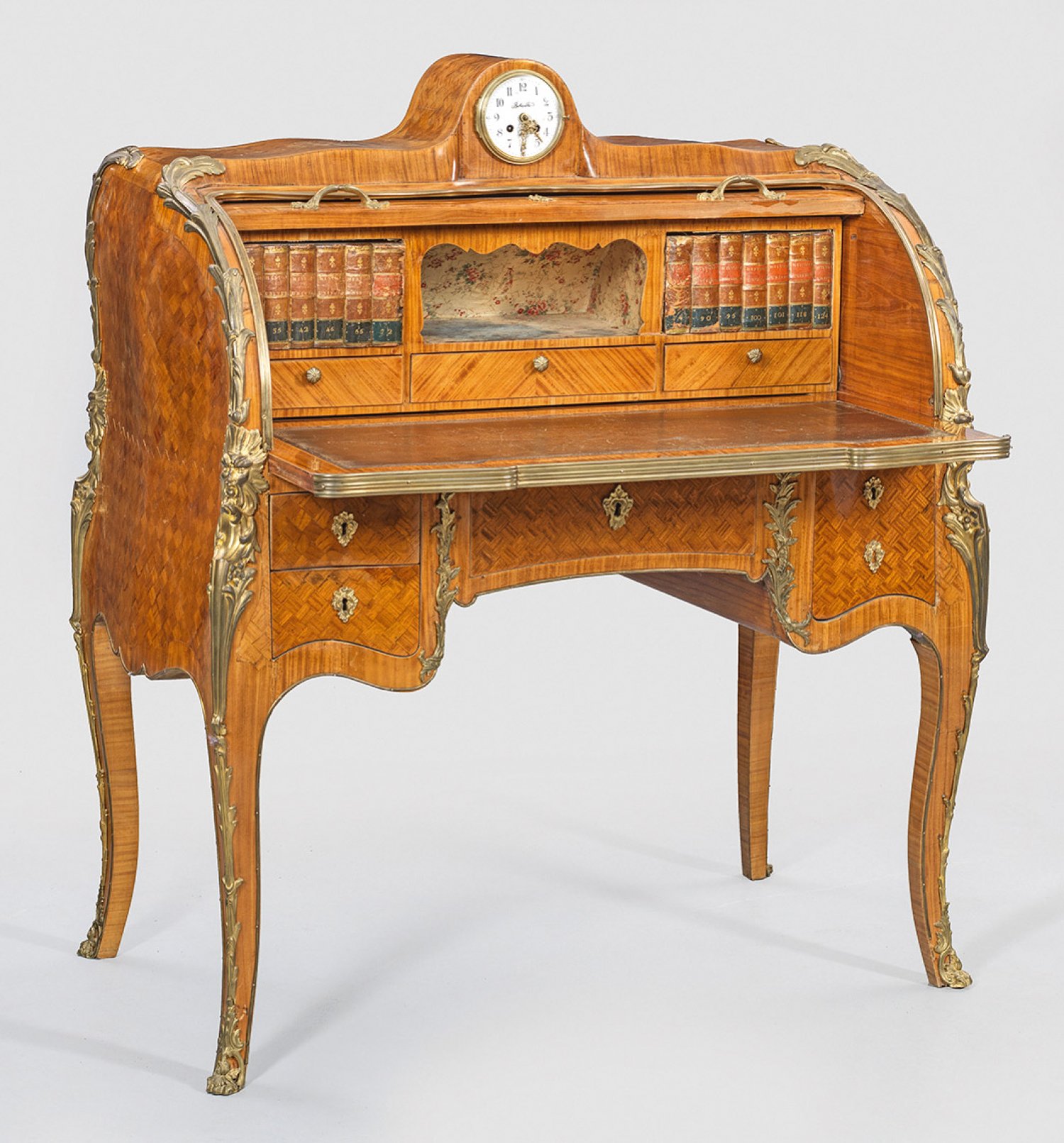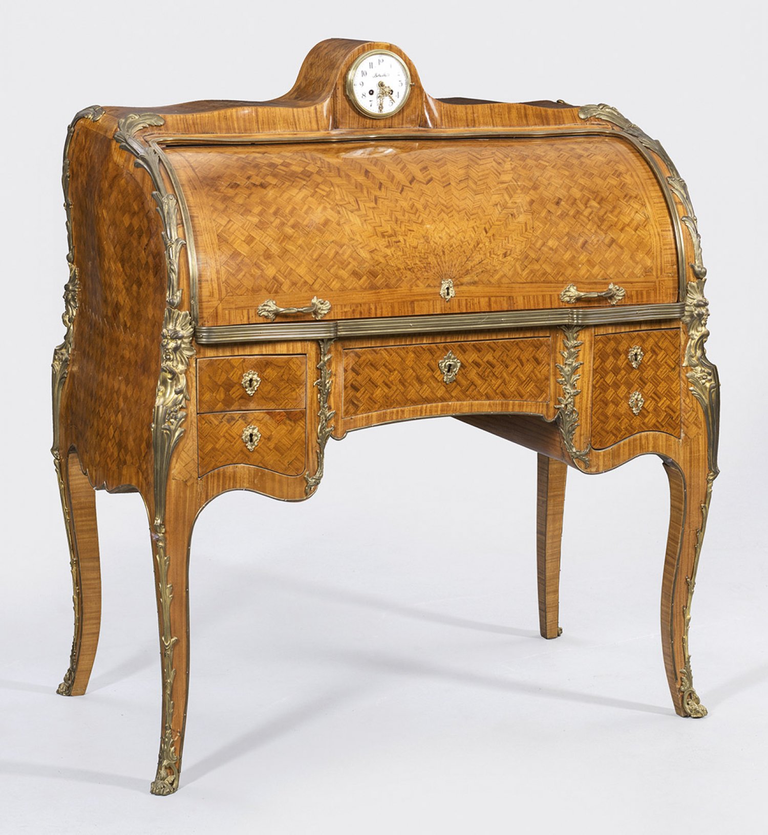 Signiertes Louis XV-Zylinderbüro von Henry Dasson Rosenholz auf Eichenholz, furniert sowie Applikationen aus Bronze. Allseitig bombierter Korpus auf hohen, elegant geschwungenen Beinen mit Maskarons. In der gegliederten Front breites Kniefach sowie vier Schubladen unterschiedlicher Größe. Oberhalb ausziehbare Arbeitsfläche mit Ledereinlage sowie bombierter Zylinderverschluss. Innen gestaffelte Facheinteilung, teilw. verkleidet mit goldgeprägten Buchrücken. Einsatz für Tinte, Streusand und Griffel. Sign. Herny Dasson. Flächendeckend breit gerahmte, gespiegelt angeordnete Furnierfelder, schauseitig aus Würfelmarketerie. Oberer Abschluss mit eingelassener Uhr. Werk mit Unruhe sowie Halbstundenschlag auf Glocke. H. 121 cm. 105 cm x 60 cm.