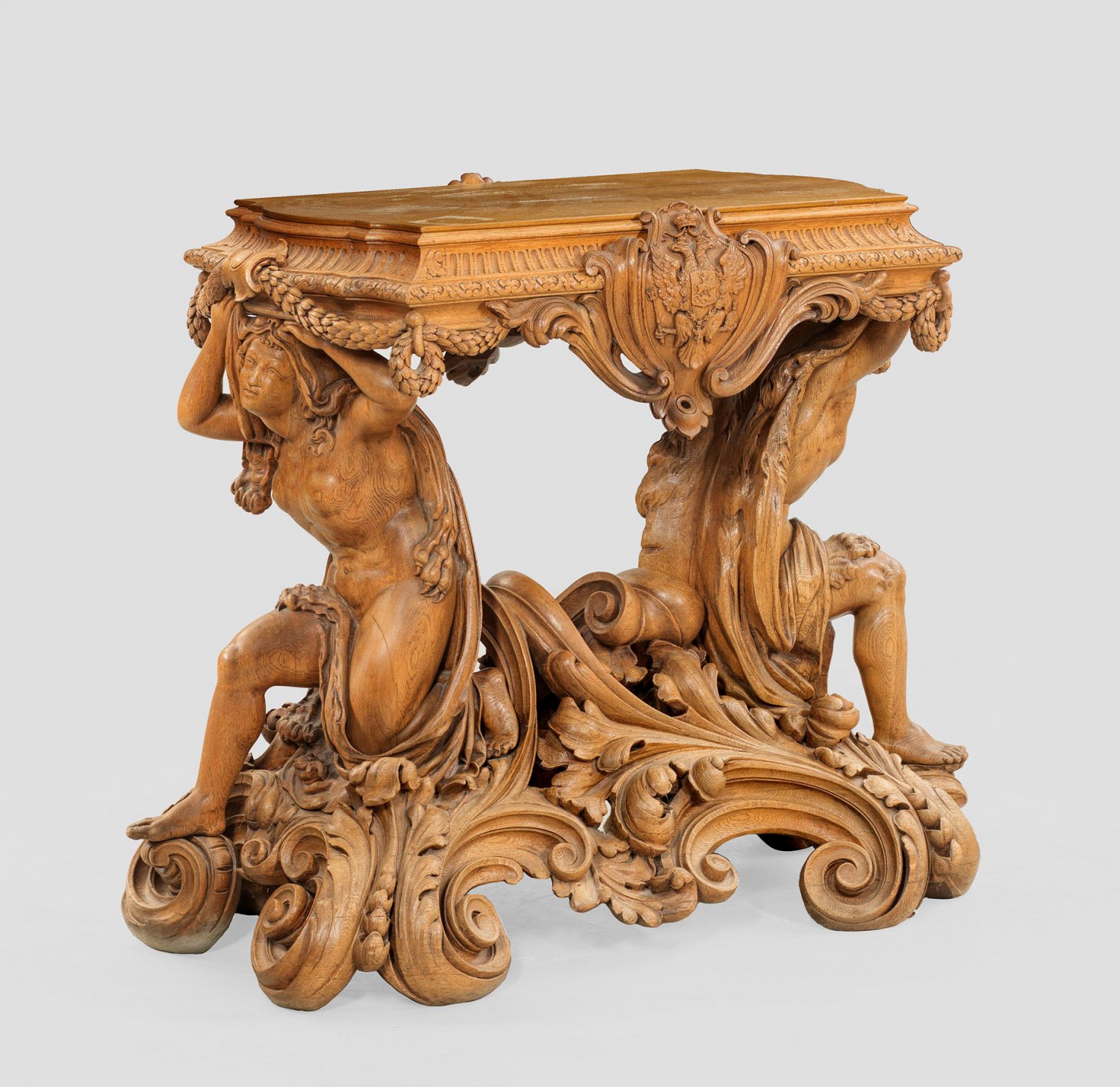 Prachtvoller Konsoltisch im Barock-Stil Eichenholz, vollplastisch geschnitzt. Geschweift ansteigender Sockel aus kraftvoll geschwungenen, eingerollten, gegeneinander gestellten Voluten und üppigem Blattwerk. Oberhalb davon ausgehend vollplastisch gestaltete Atlantenfiguren in Gestalt von Adam und Eva nach der Vertreibung aus dem Paradies als Träger für rechteckige, profilierte, umlaufend gekehlte und kannelierte Deckplatte. An den Längsseiten erhaben reliefierte, beidseitig von Blattvoluten umgebene, russische Wappenkartuschen mit bekröntem Doppeladler und Heiligem Georg für Moskau, durch üppige Festons aus Lorbeer verbunden. Mehrere Brandstempel MONBRO AINÉ. H. 104 cm. 110 cm x 70 cm.