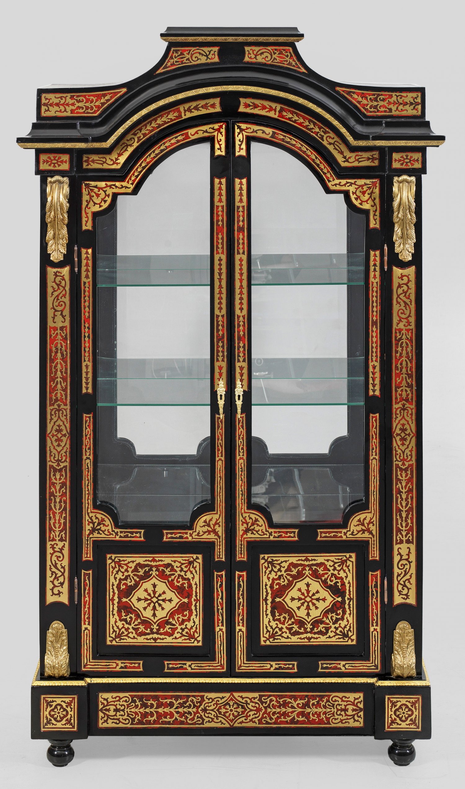 Großer Vitrinenschrank im Boulle-Stil Flächendeckender Fond aus Schwarzlack sowie Einlagen aus rot hinterlegtem Lack und Messing in sog. Boulle-Technik. Gerader, hochrechteckiger Korpus auf gekantetem Sockel und Kugelfüßen. In der gegliederten Front zwei große, gewölbte Vitrinentüren, flankiert von breiten Pilastern mit Blattvoluten. Geschweift ansteigender oberer Abschluss. Verspiegelte Rückwand und Einlegeböden aus Glas. H. 197 cm.. 113 cm x 48 cm.
