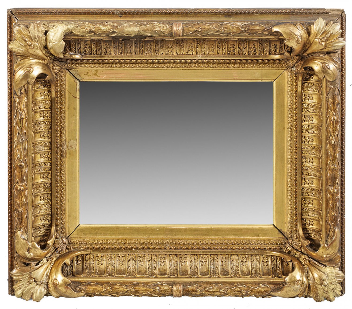 Kleiner Louis XVI-Wandspiegel Holz, stuckiert, gefasst und vergoldet. Breite, rechteckige, tief gekehlte Spiegelrahmung aus blattreliefierten Zungenmotiven, Lorbeerfries sowie großen Akanthusblättern in den Ecken. Rückseitig russisches Firmen- und französisches Verkaufsetikett sowie Rahmenkante mit russischem Doppeladler und bez. A.Geceler (...) St. Petersburg. 1895. 46 cm x 55 cm.