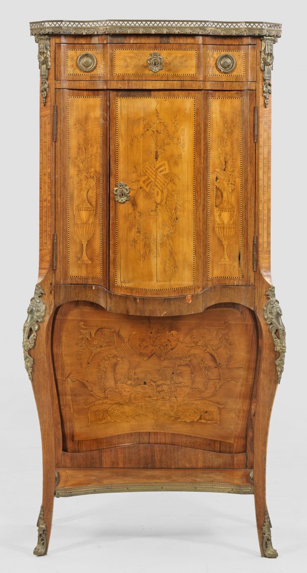 Napoleon III-Salonschrank Palisander und Ahorn, furniert. Über stark geschwungenen Beinen und seitlich ausgebogter Rückwand bombierter und teilw. konkav eingezogener Korpus. In der Front zwei Türen unterschiedlicher Größe sowie breites Schubfach. Gering überstehende Deckplatte mit durchbrochen gearbeiteter Galerierahmung. Flächendeckend breit gerahmte Furnierfelder mit intarsierten Vasenmotiven. H. 161 cm. 77 cm x 40 cm.
