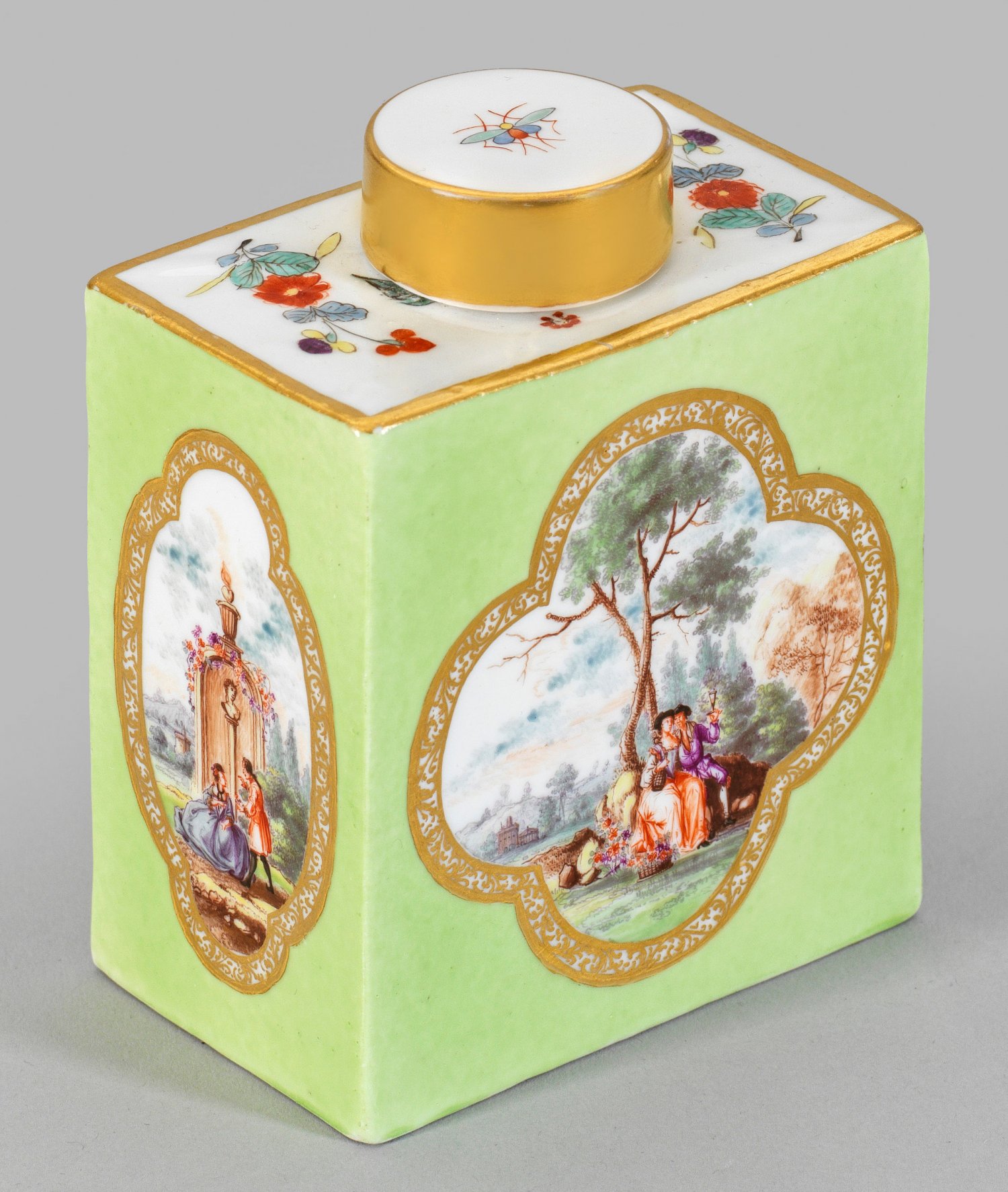Große Teedose mit seltenem Grünfond und Watteaudekor Rechteckiger Korpus mit abgeflachter Schulter, kurzem, vergoldetem Hals und übergreifendem Deckel. Allseitig auf der Wandung seltener, apfelgrüner Fond mit vierpassig ausgesparten, breiten Goldornamentreserven, darin galante, festlich gekleidete, sog. Watteaufiguren in bewachsenen, baum- und architekturbestandenen Parklandschaften in äußerst feiner, polychromer Malerei. Goldstaffage. Auf der Schulter Indianische Blütenzweige im Kakiemonstil. Gold minim. ber.; Formerzeichen für Caspar Meißner Senior (tätig seit 1710). Schwertermarke. H. 10,5 cm.