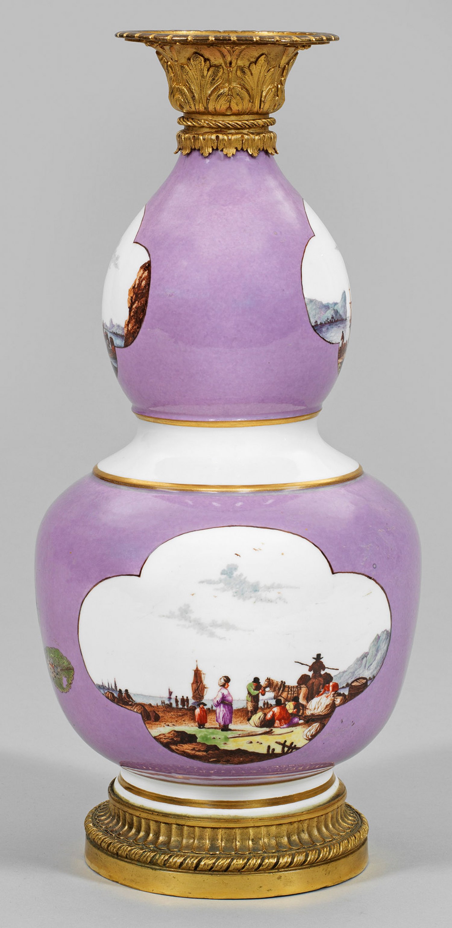 Große Kalebassenvase mit Kauffahrteiszenen mit vergoldeter, ornamental reliefierter Bronzemontierung. Doppelkürbisförmiger, eingezogener Korpus mit ausschwingendem Mündungsrand. Auf der Wandung, in fliederfarbenem Fond, vierpassig ausgesparte, braun konturierte Reserven mit mehrfigurigen sog. Kauffahrteiszenen. Vor ferner Uferlandschaft mit Segelbooten stehende Kaufleute und Orientale beim Verhandeln von Gütern sowie Arbeiter beim Verladen der Ware. Auf dem unteren Wandungsteil farbige Darstellung einer Fliege und eines auf einem Blatt sitzenden Käfers. Feine polychrome Malerei mit Goldrand. Rest.; Schwertermarke. H. 37,5 cm.