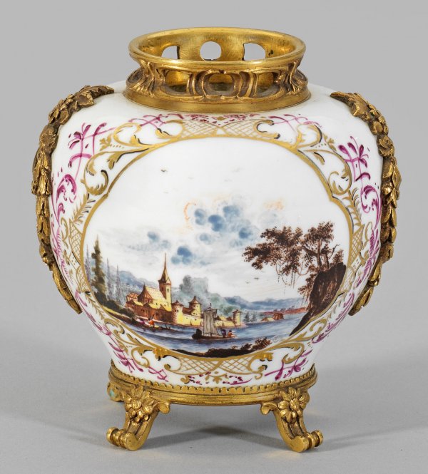 Ziervase mit Kauffahrteiszenen Gebauchter Korpus mit gerundeter Schulter auf vier Volutenfüßen. Beidseitig der Wandung, von Laub- und Bandelwerk gerahmte Goldreserven mit sog. Kauffahrteiszenen, weite Uferlandschaften mit Seglern und Fischern vor imposanter Architekturkulisse in äußerst feiner polychromer Malerei. Reliefplastisch ornamentierte, vergoldete Bronzemontierung bzw.- applikationen mit Rocaille-, Blatt-, Blüten- und Gitterwerk. Schwertermarke. H. 10,5 cm.