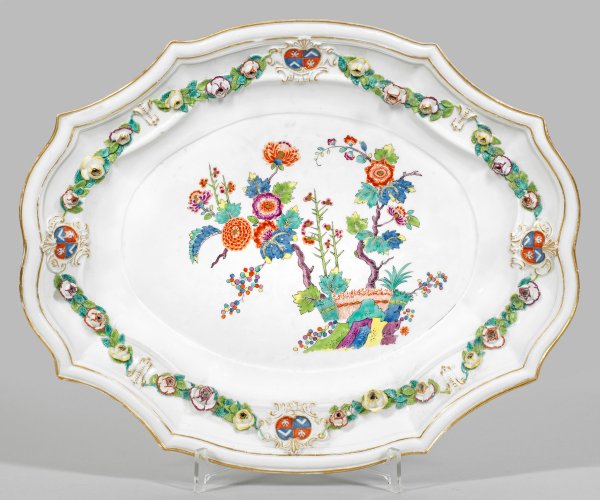 Großes Ziertablett mit Kakiemondekor Ovale Form mit gestuft ansteigender Wandung und passig geschwungenem Profilrand. Im vertieften Spiegel, hinter stilisierten Felsen sowie eisenroter und seegrüner Reisstrohhecke emporwachsender, sich weit verzweigender Prunus- bzw. Chrysanthmenbaum. Auf der Fahne plastisch aufgelegte Blumenfestons im Wechsel mit muschelbekrönten Reliefkartuschen, das Wappen des Grafen Heinrich von Brühl darstellend. Polychrome, Gold gehöhte Malerei im Kakiemonstil (später). Goldkonturierung. Minim. best.; Schwertermarke. 41 cm x 33 cm.