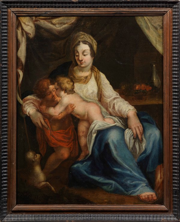Szenische Darstellung mit der an einem gedeckten Tisch sitzenden Maria, in ihrem Schoß das Kind, welches Johannes freudig umarmt, am linken Bildrand das Lamm Gottes und ein Kreuzstab als Attribute des Johannes und Symbole der künftigen Passion. Öl/Lwd., doubl.; 87 cm x 70 cm. Rahmen.