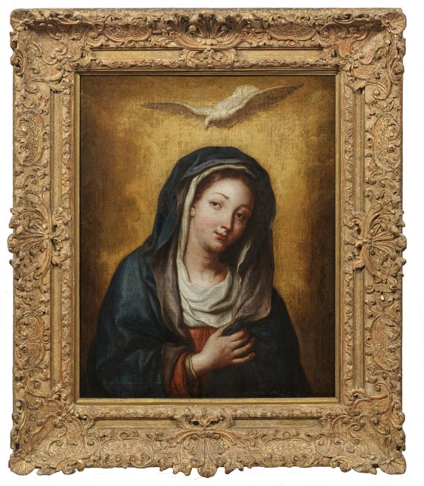 Andachtsbild der italienischen Schule, das den prägendenden Einfluss Guido Renis und seines Schülers Sassoferato auf die Mariendarstellungen des Barock wiederspiegelt. Sassoferrato entwickelte mehrere Typen von Madonnen- und Marienbildnissen, die er meisterhaft variierte. Wie auf diesem Gemälde haben diese stets weiche Gesichtsszüge und Hände, die Stoffe wirken dick mit teigiger Faltengebung, das Kolorit ist zumeist dezent. Öl/Lwd.; 71 cm x 56 cm. Barock-Rahmen.