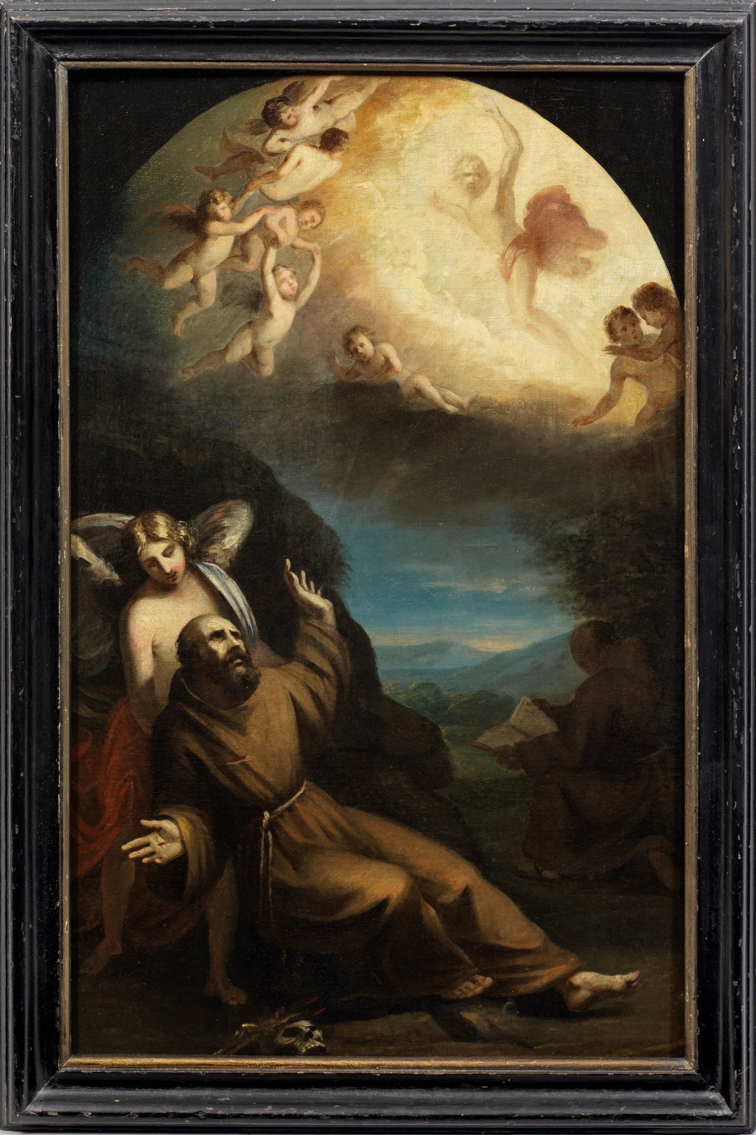 Die hochformatige, bogenförmig angeschlossene Komposition schildert die Vision des Hl. Franziskus auf dem Berg La Verna (Alverna) mit Christus am Kreuz, durch den er fünf Wundmale empfängt. Franziskus ist aufgrund der Wirkmacht Christi und der von ihm ausgehenden Strahlen im Umfallen begriffen und muss von einem großen Engel gestützt werden, während der oben hell erleuchtete Himmelsraum vom Gekreuzigten und kleineren Engeln dominiert wird. In dem Gemälde verbinden sich verschiedene Einflüsse und Traditionen, während die effektvolle Hell-Dunkelmalerei von den lombardisch-römischen Caravaggisten inspiriert worden sein dürfte, weisen andere Stilelemente auf Einflüsse der in Rom tätigen Maler Giovanni de Vecchi (1536 - 1615) und insbesondere Nicolas Poussin (1594 -1665) hin. Öl/Lwd., auf Holztafel kaschiert. 69 cm x 44 cm. Rahmen.