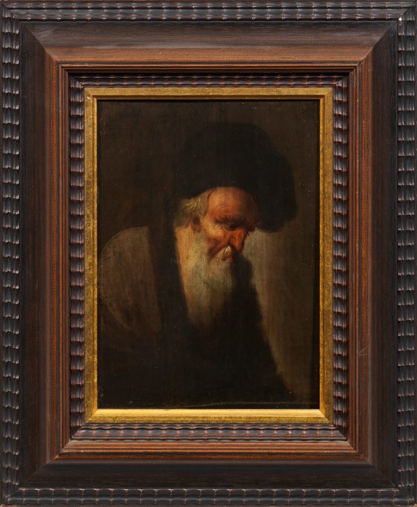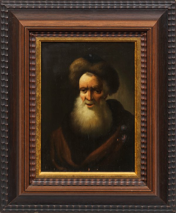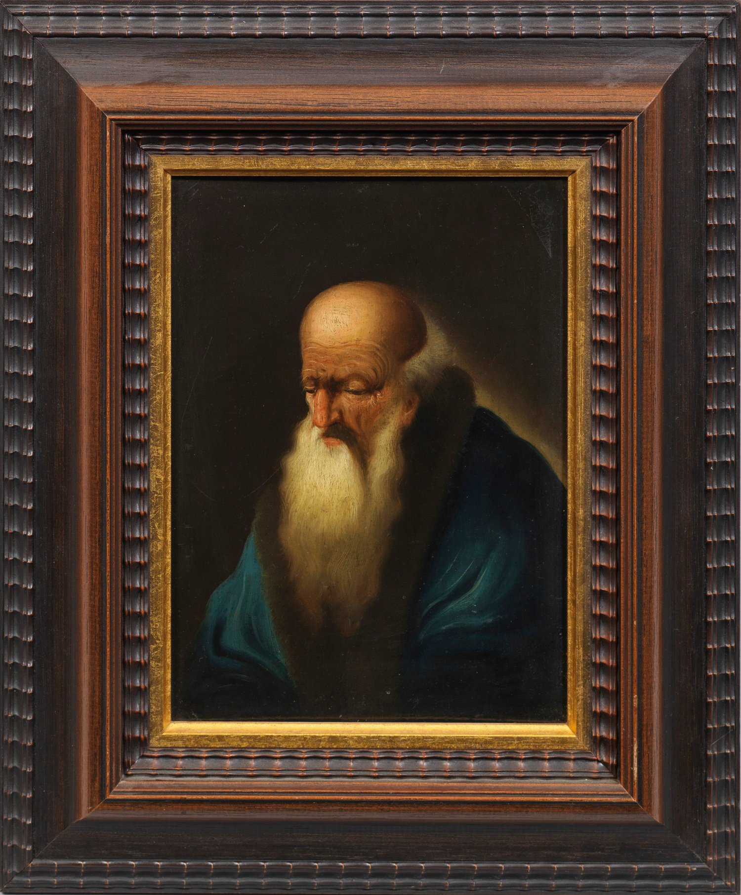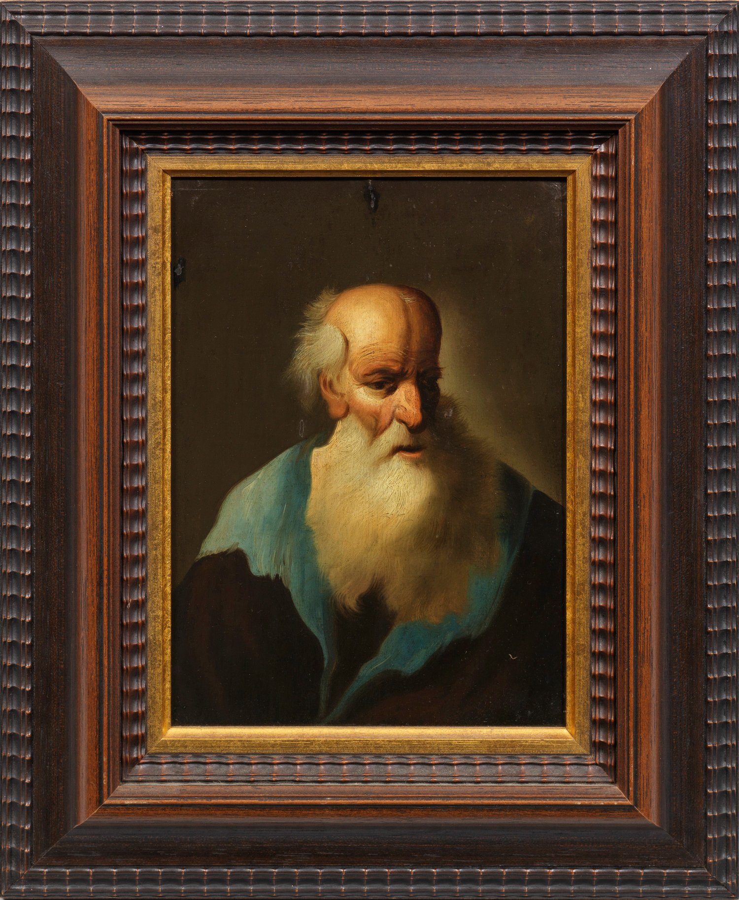 Darstellungen der weißhaarigen, vollbärtigen, attestamentlichen Propheten im Greisenalter, teilw. mit großen Pelzmützen bzw. pelzverbrämten Mänteln. Die in fein lasierender Malweise ausgeführten, charakteristischen Bildnisse entstanden unter dem prägenden Einfluss von Rembrandts Greisendarstellungen. Öl/Holztafel. 29 cm x 19 cm. Rahmen.