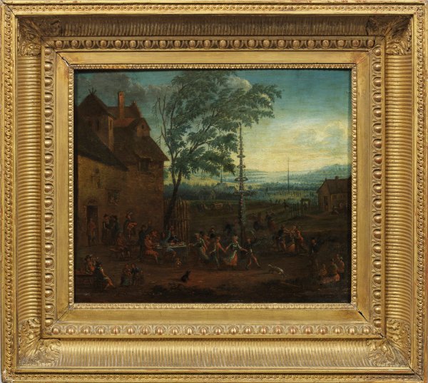 Thematisch und koloristisch mit Braun-Rot dominiertem Vordergrund und grün-blauem Tiefenraum typisches Werk der flämischen Barockmalerei, speziell der Brueghel-Schule. Die detailreiche, erzählerische Darstellung in der Tradition der Kirmesbilder von Jan Brueghel d. J. zeigt einen geschmückten Maibaum, um den Personen ausgelassen tanzen. Vor dem Haus wird getrunken, gegessen und geraucht, in der Tiefe ein weiterer Maibaum mit Tanzenden. Öl/Holz, aufgedoppelt. 38 cm x 47 cm. Rahmen.