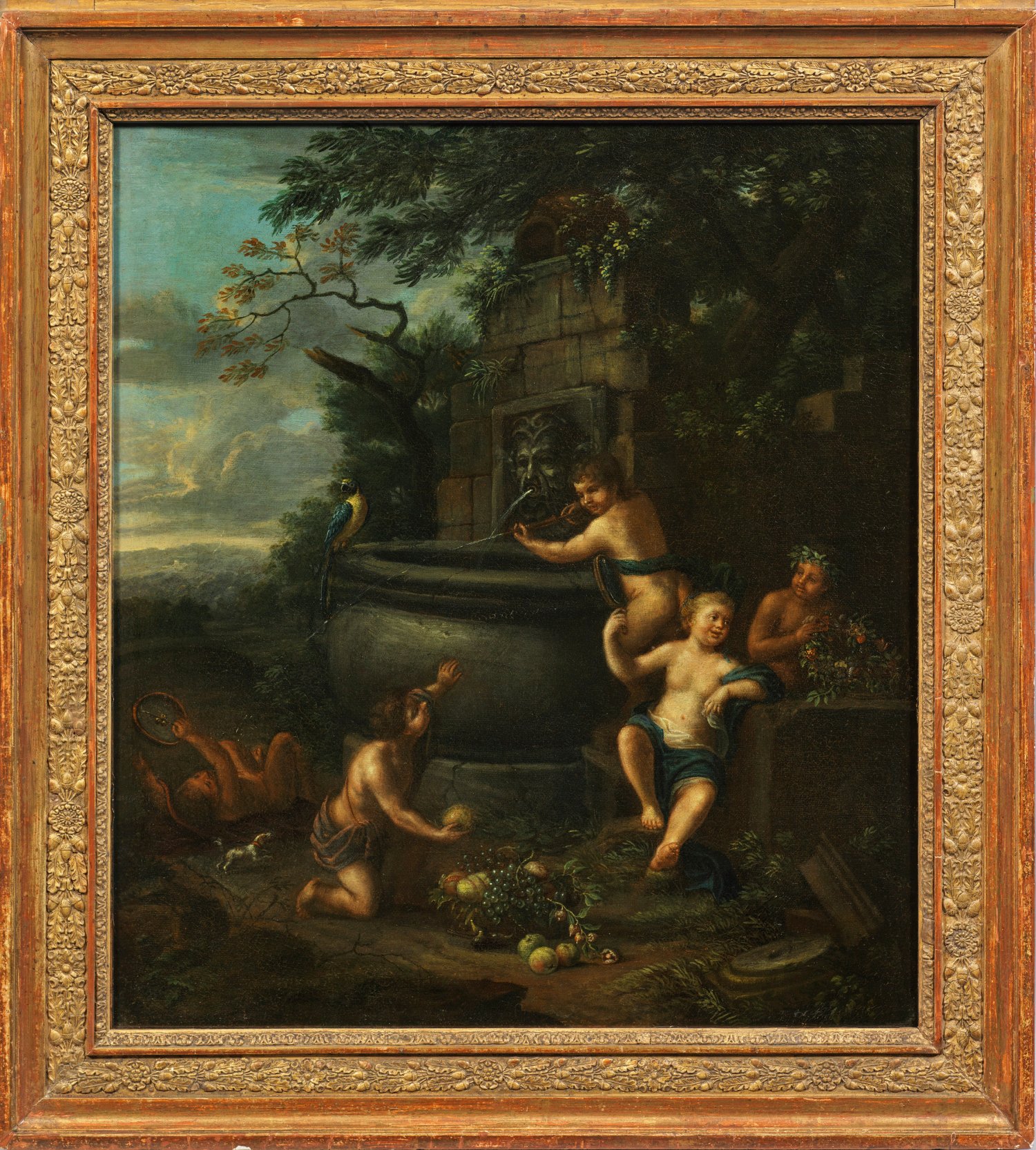 In eine Landschaft komponierte Szene an einem alten Brunnen mit Ruinenarchitekturelementen, Papagei und kleinem Hund. Ein Knabe beschießt mit einer Spritze einen links am Boden liegenden Putto mit Tamburin, während weitere Putti sich im Spiegel betrachten bzw. sich mit einem Blumenkranz und einem Früchtekorb beschäftigen. In Motiv und Stil charakteristisches Werk des flämischen Malers, der vornehmlich heitere Puttimotive in Landschaften schilderte. Öl/Lwd., doubl.; 56 cm x 49 cm. Rahmen.