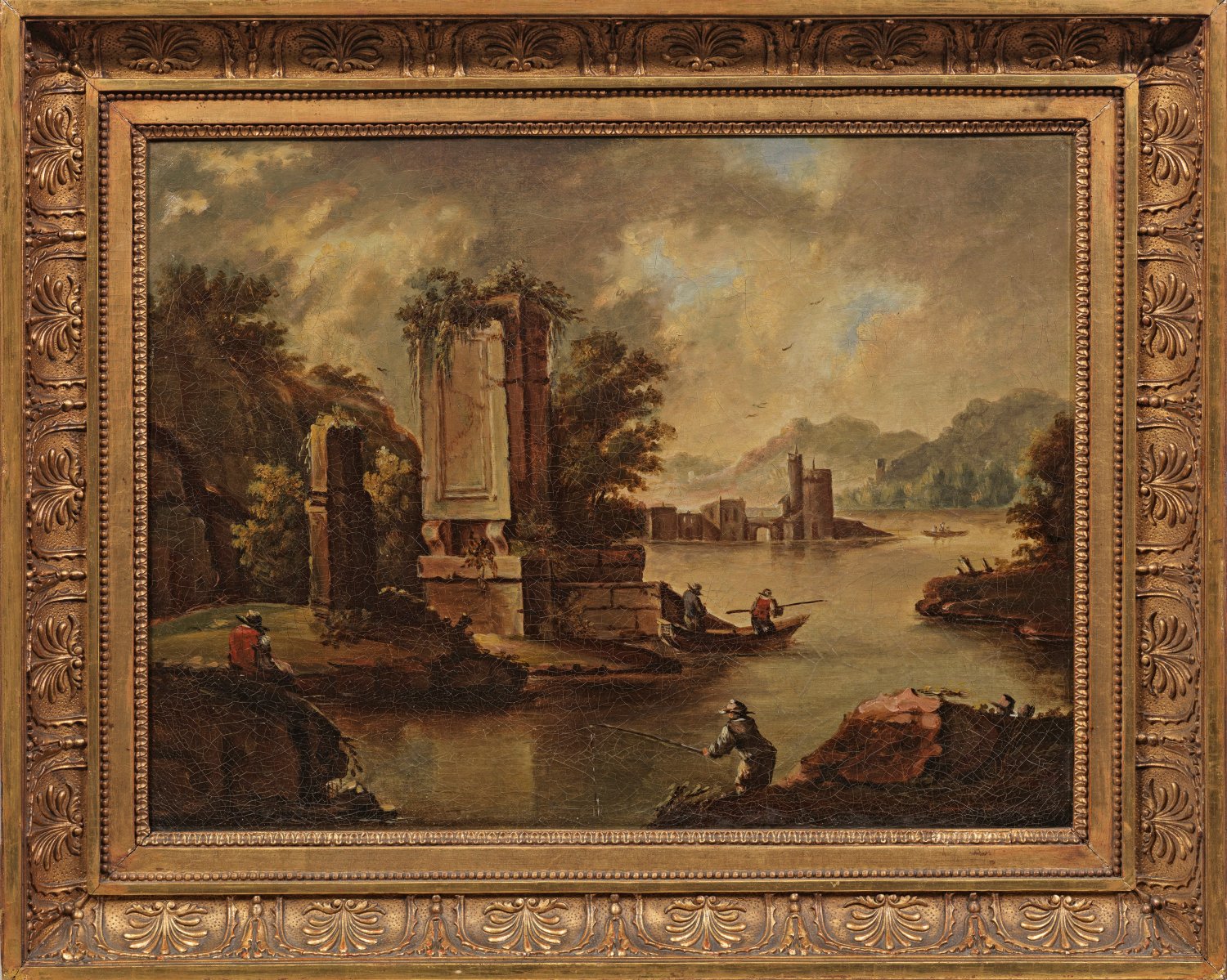 Warmtonig gemalte, von Lorrain inspirierte, italienisierende Küsten- bzw. Flusslandschaft mit pittoresken Ruinen- und Architekturmotiven. Seit seiner Jugend in Italien tätig, etablierte sich Lorrain dort als führender und einflussreicher Landschaftsmaler des Barock. Er schilderte oft arkadische Motive, Küsten- und Hafenszenerien und komponierte biblische und mythologische Szenen in idealisierte Landschaften. Mit seinen Landschaften prägte er die europäische Landschaftsmalerei bis weit in das 18. Jh. und beeinflusste noch Claude-Joseph Vernet (1714 - 1789). Lorrains Einfluss erstreckte sich sogar auf die Landschaftsgestaltung von Parks und Gärten sowie auf das Landschaftserlebnis selbst - Maler und Reisende des 18. Jhs. benutzten sog. Claude-Gläser mit Tönungen als Hilfsmittel, um einen Landschaftseindruck wie auf den Gemälde Lorrains wahrzunehmen. Öl/Lwd., doubl.; 55 cm x 74 cm. Rahmen.