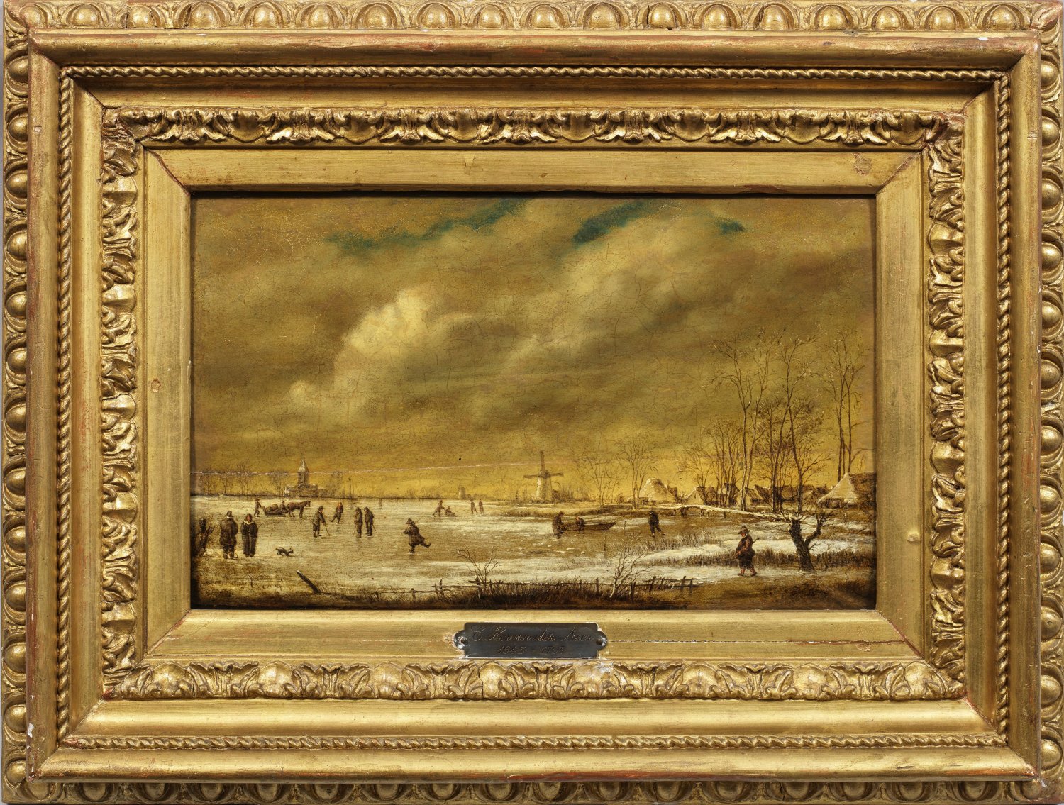 Kleine, seltene Landschaft in der Tradition seines Vaters Aert van der Neer, bei dem er lernte. Bekannt wurde Eglon van der Neer, der in Frankreich, den Niederlanden und Düsseldorf sowie 1681-1689 in Brüssel tätig war, insbesondere durch seine Genrebilder, weiblichen Bildnisse und Darstellungen junger, musizierender Frauen. Öl/Eichenholzafel. L. u. sign.; Verso altes Etikett "N. V. KUNSTHANDEL DE BOER HERENGRACHT (...) AMSTERDAM" (nach 1927). Rest. Riss. 22,5 cm x 37,5 cm. Rahmen.