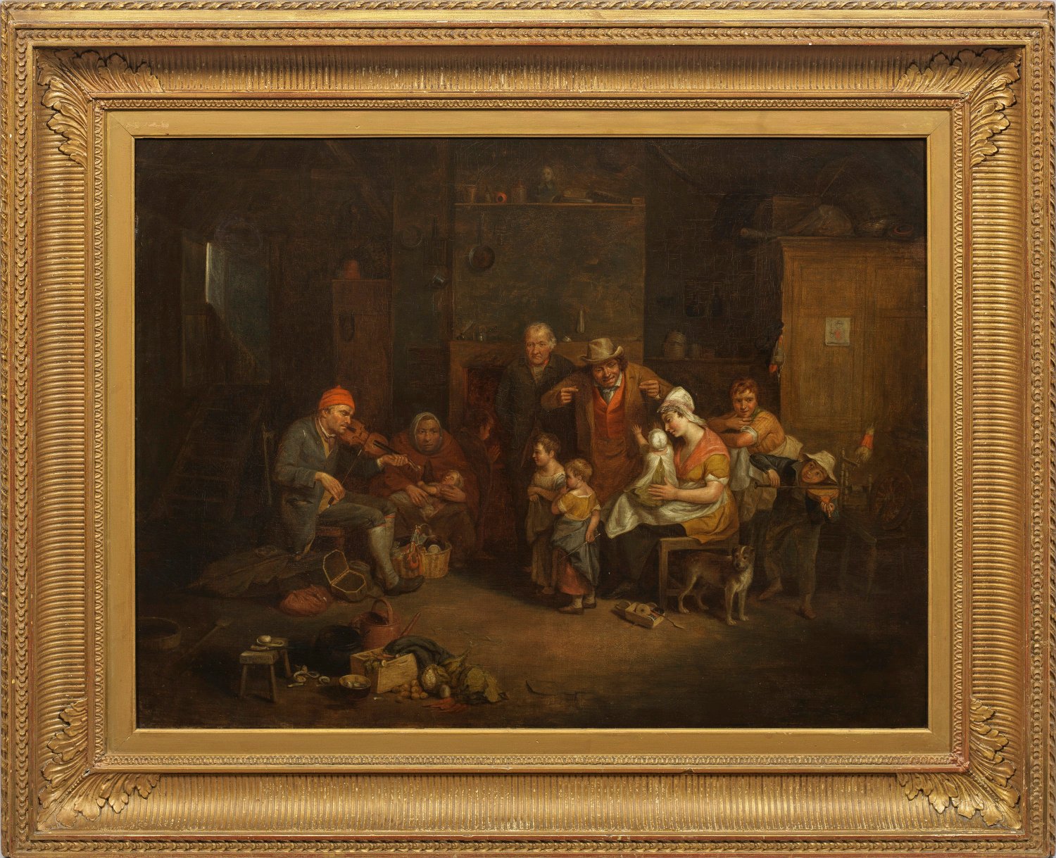 In feinmalerischer Qualität ausgeführtes Genremotiv im Stil der altniederländischen Malerei. In einer geräumigen Diele drei Familien sitzend der Musik von zwei Fiedelspielern lauschend. Alle tragen wärmende Kleidung und sitzen dichtgedrängt vor dem offenen Kamin. Stilllebenartig bleiben Strick- und Nähzeug, Spinnrad und zu putzendes Gemüse unberührt. Öl/Lwd., doubl.; 58 cm x 78 cm. Rahmen.