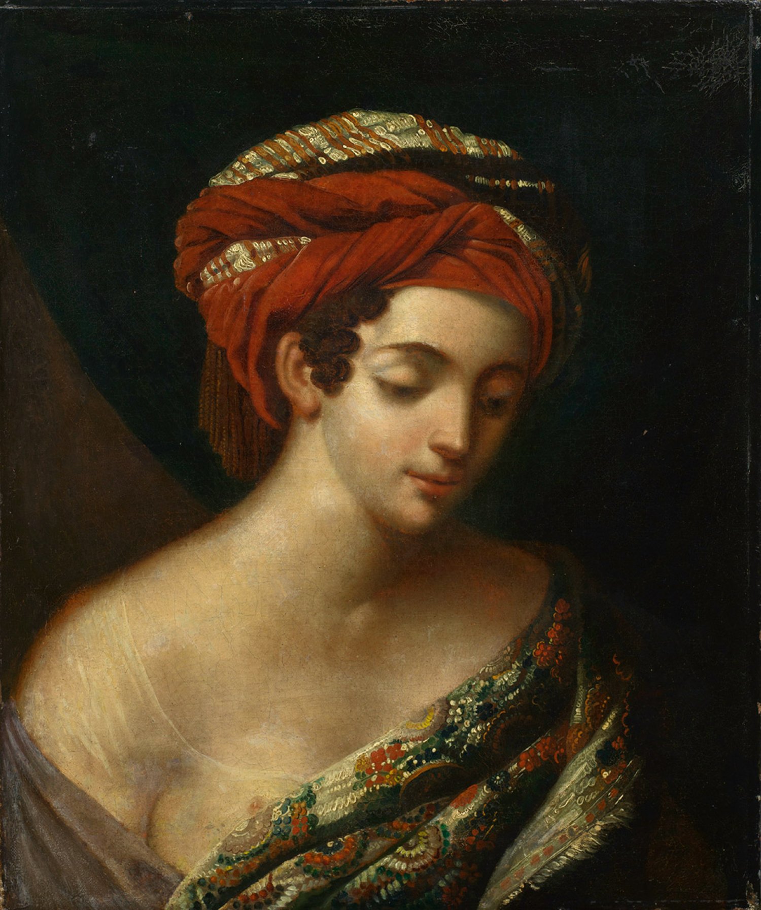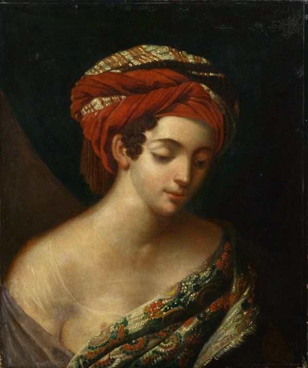 Feinflüssig gemaltes Empire-Bildnis einer jungen, sinnierenden Frau im Halbprofil, bekleidet mit einem zarten Chiffongewand und einem um die linke Schulter gelegten, orientalischen Tuch. Nachdem Maler und Zeichner schon in der Renaissance und im Barock zuweilen Turbane als fremdländisches, orientalisches Element bei Porträts einsetzten, wurde der Turban im Empire um 1800 auch ein höchst beliebtes Accessoire in der Damenmode und hiermit auch in Bildnissen, u. a. von Anne Louis Girodet de Roucy Trioson (1767 - 1824) und François Gérard (1770 - 1837). Eine Vorreiterin war Elisabeth Louise Vigée Le Brun (1755 - 1842), die schon seit den 1780er Jahren gern Turban trug und sich selbst und später auch die Damen der Gesellschaft mit dieser Kopfbedeckung darstellte. Öl/Lwd.; 57 cm x 48 cm.