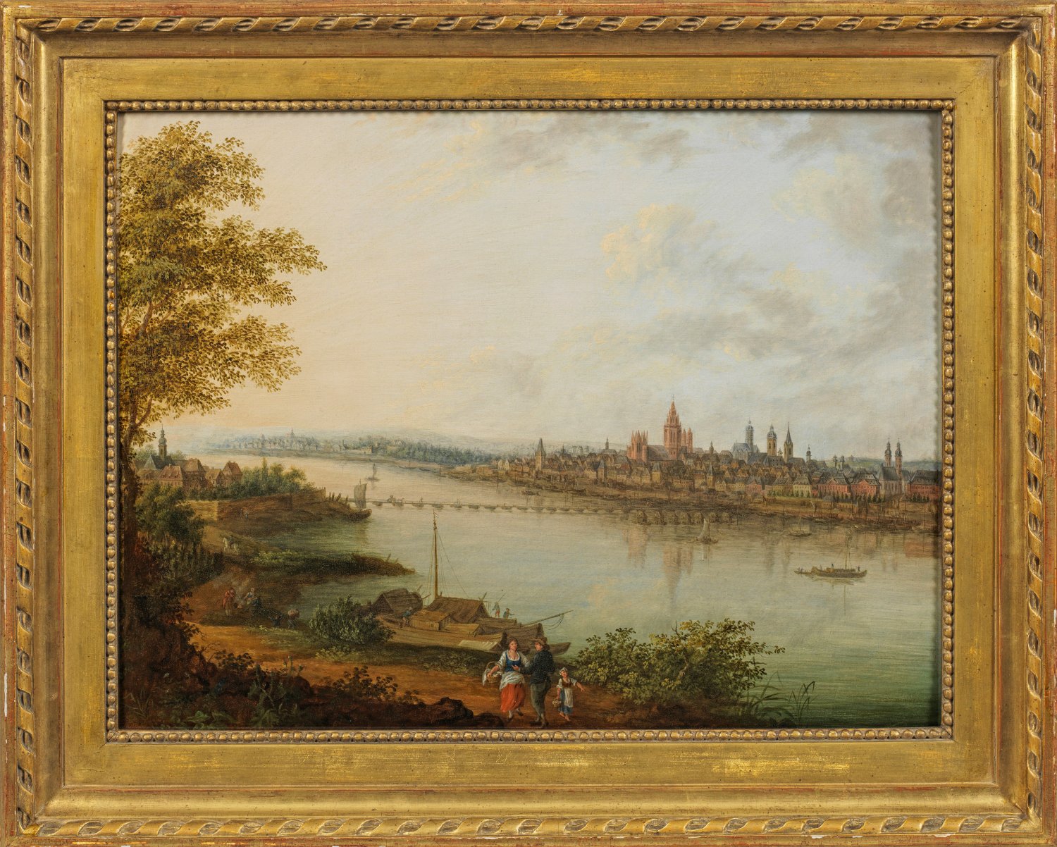 In sehr fein lasierender Malerei ausgeführte, detailreiche Vedute von Mainz, die im Vordergrund durch eine Staffage aus Figuren und Schiffen belebt wird. Seltenes Gemälde Ludwig von Kesselstadts, der als Maler, Kunstsammler und Domherr in Mainz wirkte. 1778 wurde er Kapitular des Mainzer Erzstiftes, seine künstlerische Ausbildung erhielt er bei den Mainzer Malern Johann Kaspar Schneider und Johann Jakob Hoch. Ende des 18. Jhs. und zu Beginn des 19. Jhs. fertigte Franz Ludwig von Kesselstadt Zeichnungen mit Mainzer Stadtansichten, einzelnen Gebäuden und Landschaften an, die teilw. von Hoch und Schneider aquarelliert oder von anderen Künstlern als Radierungen und Kupferstiche umgesetzt wurden. Da er seine Werke meist an Kunstfreunde verschenkte, ist sein Oeuvre in zahlreichen privaten und öffentlichen Sammlungen verstreut, wie dem Landesmuseum Mainz, das mehrere Stadtansichten von seiner Hand besitzt. Öl/Eichenholztafel. R. u. sign. u. dat. 1827. 39 cm x 52 cm. Rahmen.