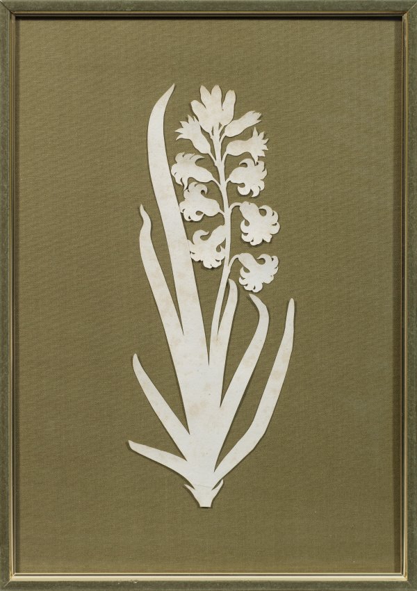 Um 1806-1810 entstandener Scherenschnitt aus weißem Papier, auf textilem Untergrund montiert. Der 2018 im Besitz der mit Runge eng verbundenen Künsterfamilie Speckter wiederentdeckte Pflanzenschnitt gehört zu dem bedeutenden Werkkomplex von Scherenschnitten im Oeuvre des Frühromantikers. Die vorliegende Hyazinthe zeigt in ihrem Echeinungsbild evidente Parallelen zu anderen bekannten Scherenschnitten Runges von dieser intensiv duftenden Blütenpflanze mit ihrer tiefen Symbolik. Charakteristisch für seine Auffassung sind die scharf geschnittenen, schwertförmigen Blätter, die sich formal vom feingliedrigen Blütenstand abheben. Durch die Blüten in unterschiedlichen, biologisch prozesshaften Öffnungsstadien erhält der Scherenschnitt zugleich eine entscheidende Dynamisierung. Runges Scherenschnitte von Pflanzen sind von konzentrierter Schönheit und Ausdruck seiner romantischen Naturfrömmigkeit. Bereits als Kind an Tuberkulose erkrankt, entdeckte Runge früh seine Neigung zum Scherenschnitt und Pflanzenmotiven. Goethe sandte er zahlreiche Blumen für die Zimmerdekoration samt Anleitung zur Anbringung und Aufbewahrung der Schnitte. 1805 gelang ihm der künstlerische Durchbruch mit Radierungen zu seinen Scherenschnitten in dem Zyklus "Die Zeiten", der in einer ersten Kleinstauflage von 25 Exemplaren erschien. Eines erwarb Goethe und schmückte damit sein Musikzimmer mit der Beurteilung: "zum rasend werden, toll und schön zugleich". Scherenschnitt ca. 25,5 x 10 cm. Rahmen.